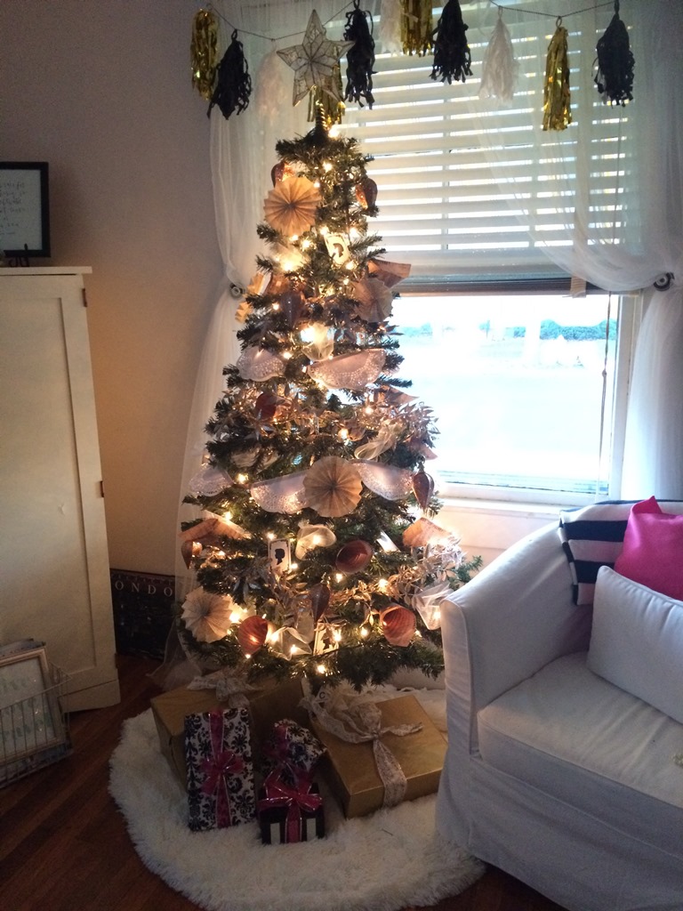 Since our living room tree isn’t entirely visible from the outside, I position this one right in the front window. For the people who do happen to notice 2 trees in the front rooms, they must think I’m crazy. I completed the look for this tree with a cream faux fur tree skirt and some gold and black and white presents. Jamie says it’s his favorite tree because it’s mostly all stuff I made. There are even some sentimental ornaments on there that I either made or were from when I was little. One of my resolutions for the New Year is to spend more time in here and really get things organized. Hopefully I stick to that goal!