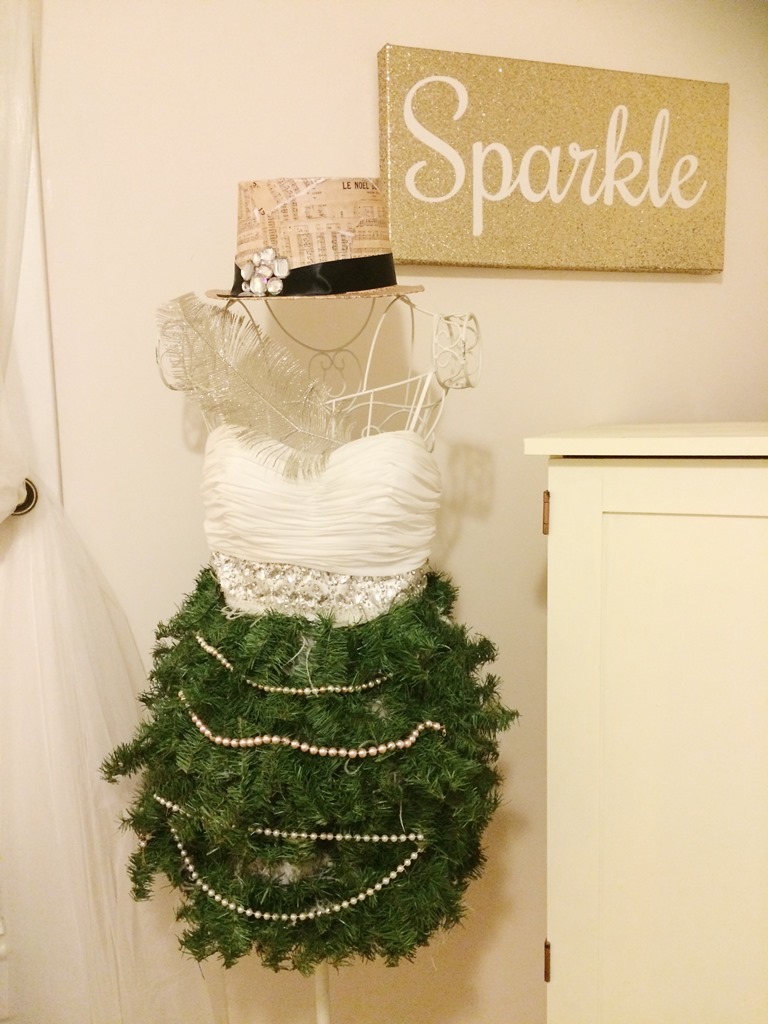 One new thing I tried this year was something I’d been seeing all over Pinterest. I have this dress form in the office year round and it displays the reception dress from our wedding. I wanted to leave it on there but Christmas it up so I bought 3-9′ rolls of garland and started wrapping. It was actually more difficult than I thought because the feathers and satin fabric of the skirt made the garland slip A LOT. I finally called Jamie in to give me a hand and we rigged it with some jewelry wire.