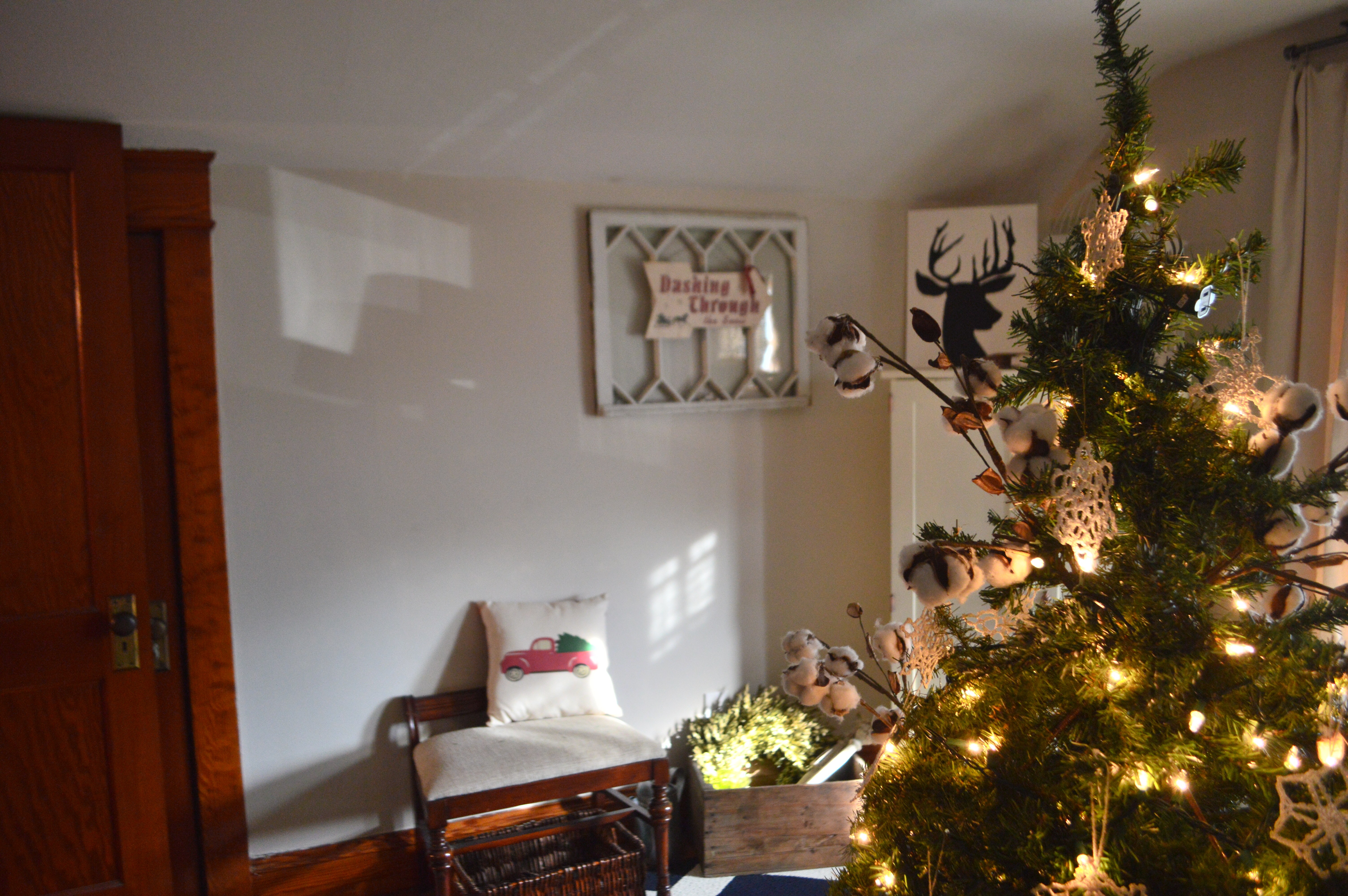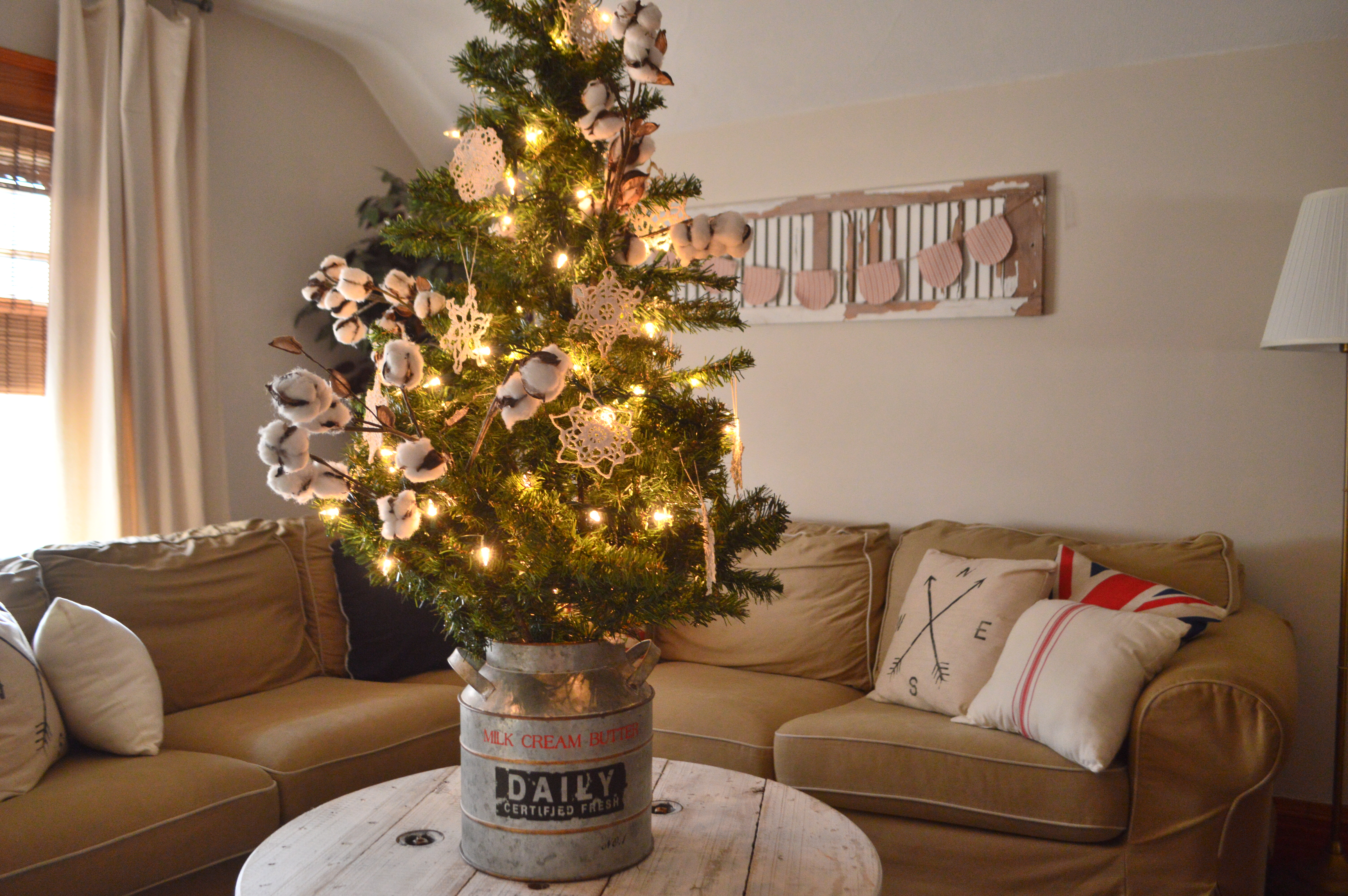 Our last tree is in our bonus room. This room has a farmhouse-like feel. Last year I had it in a giant drink bucket on top of a sled. Some furniture found a new home in there this past year so I moved the tree to the metal milk can on top of the coffee table. I love the look and wish we spent more time in here but we never have the need to use it.