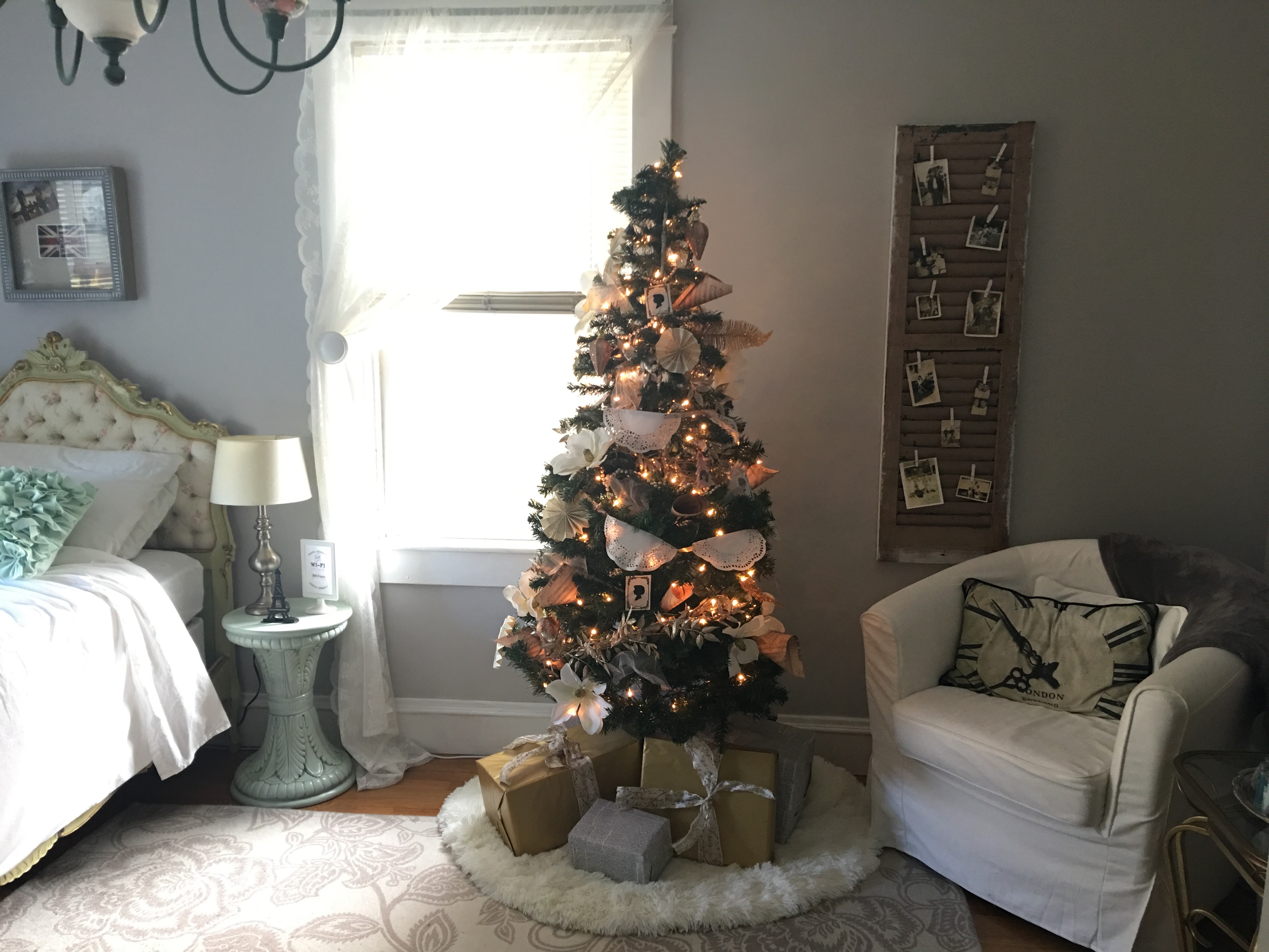 The guest room has the musical/Victorian themed tree. This is one of my favorite trees. I leave them decorated all year and just cover them with giant trash bags after Christmas. I’m thinking about taking all the ornaments off this one this year and flocking the tree because I think that would be a perfect touch. I’m just a little obsessed with flocked trees in case you couldn’t tell.
