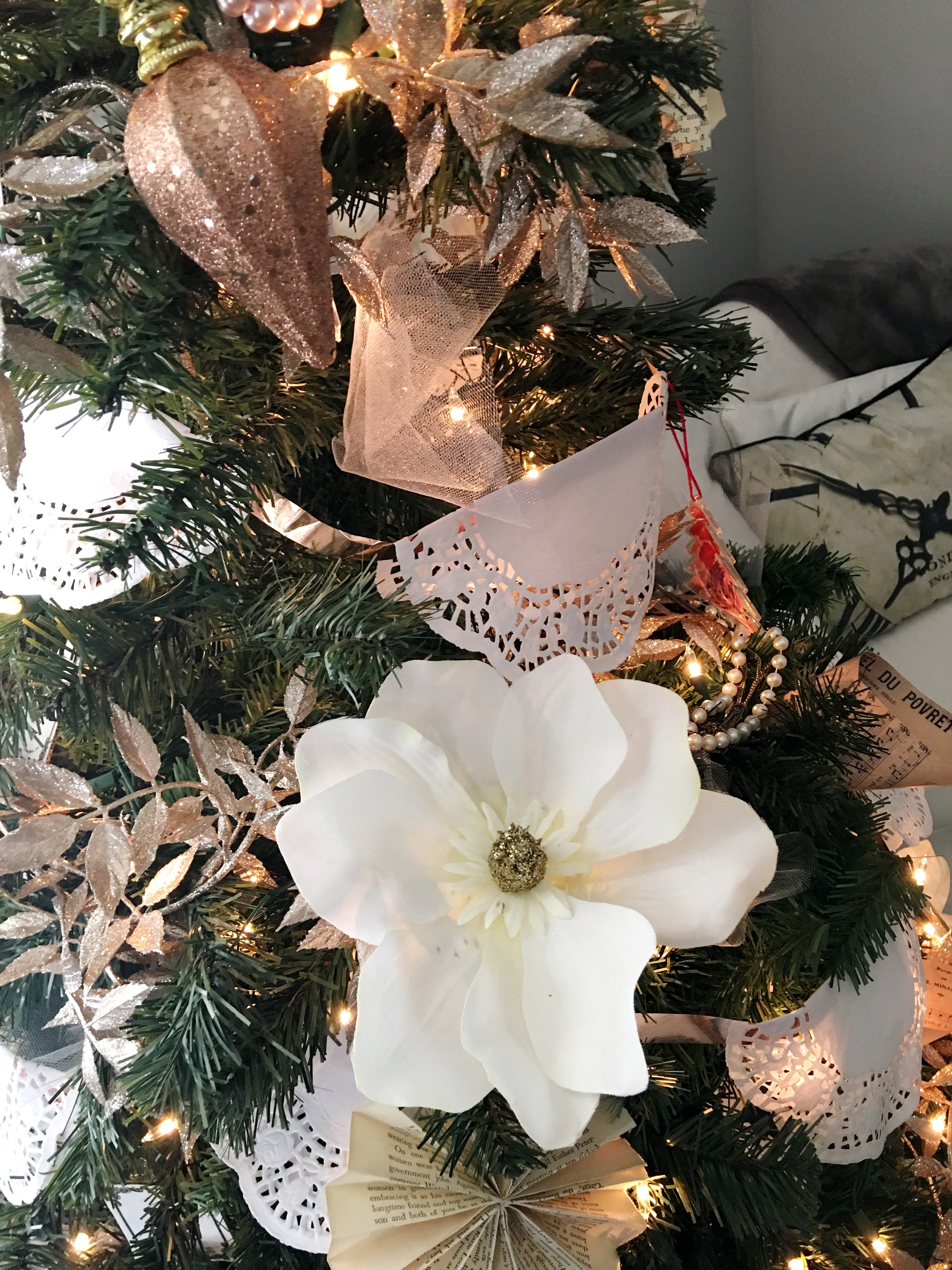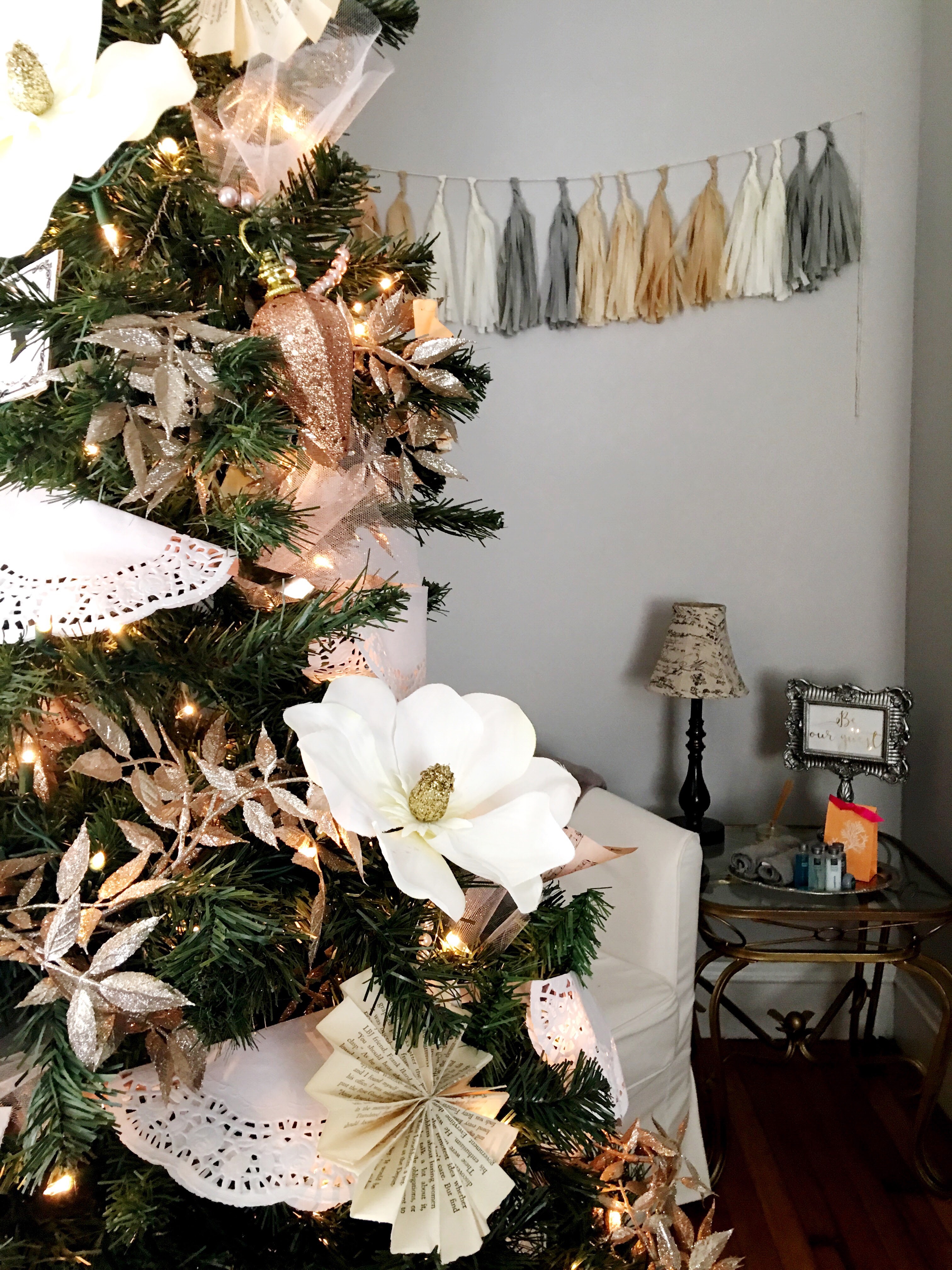 I love the whimsy of the office tree. This is the second year the white tree has made an appearance in this room. It compliments it perfect and I love the bold colors against the white tree. I incorporated the buffalo check ribbon in here to tie everything together. If you notice, each tree has something to tie it to another tree in the house (plaids, sheet music, etc.) I’m overhauling this office come the New Year and I can’t wait to share it with you.