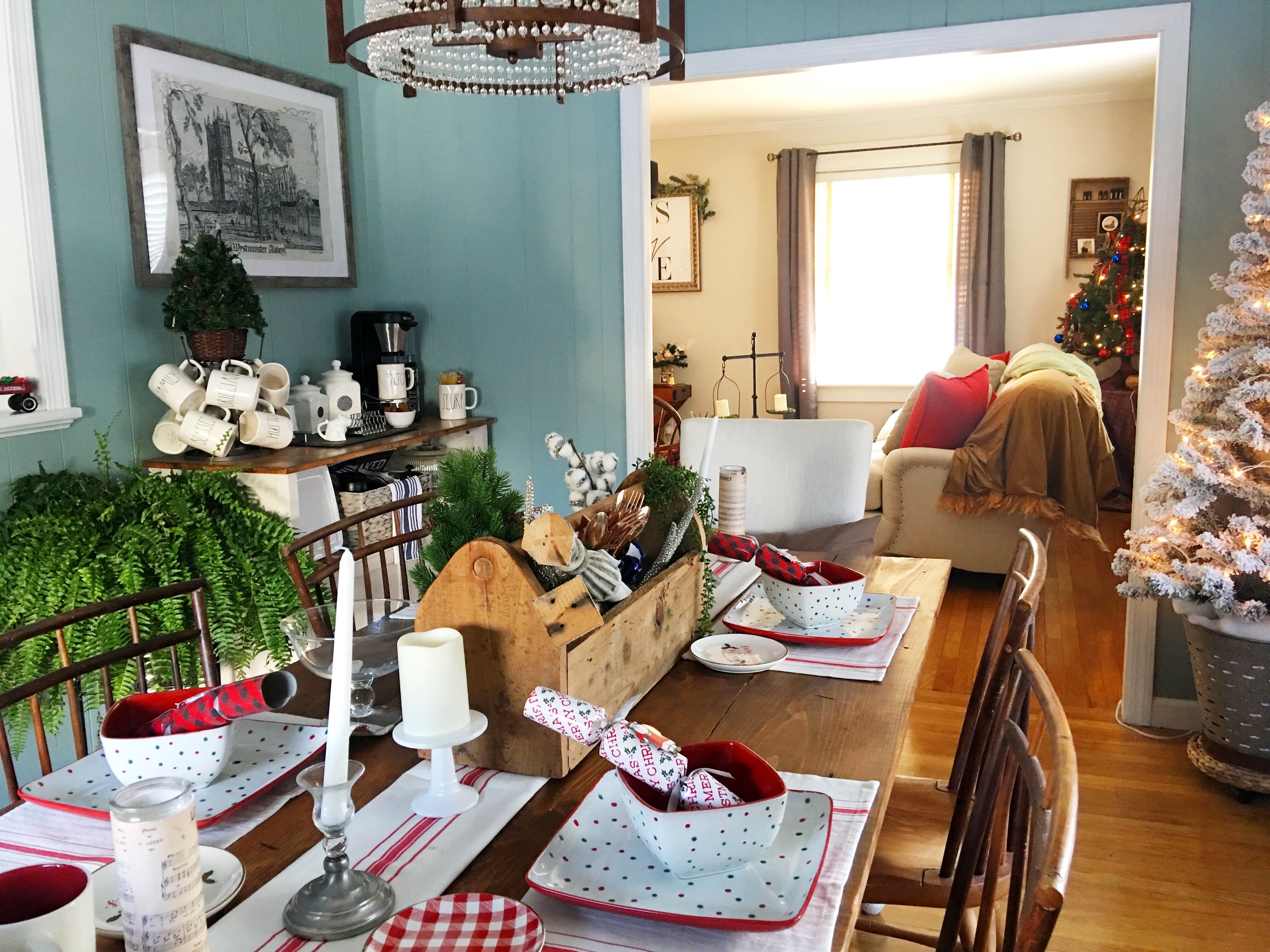Jamie built me a toolbox out of reclaimed wood from our house and I wanted to use it on the table this year. I filled it with a cotton stem, some greenery, my rose gold flatware and some rhinestone antlers I got on clearance at Walmart after Christmas last year. The table is all ready for our Christmas guests with a Christmas cracker at each place setting. This has been a family tradition for years and it’s my favorite!