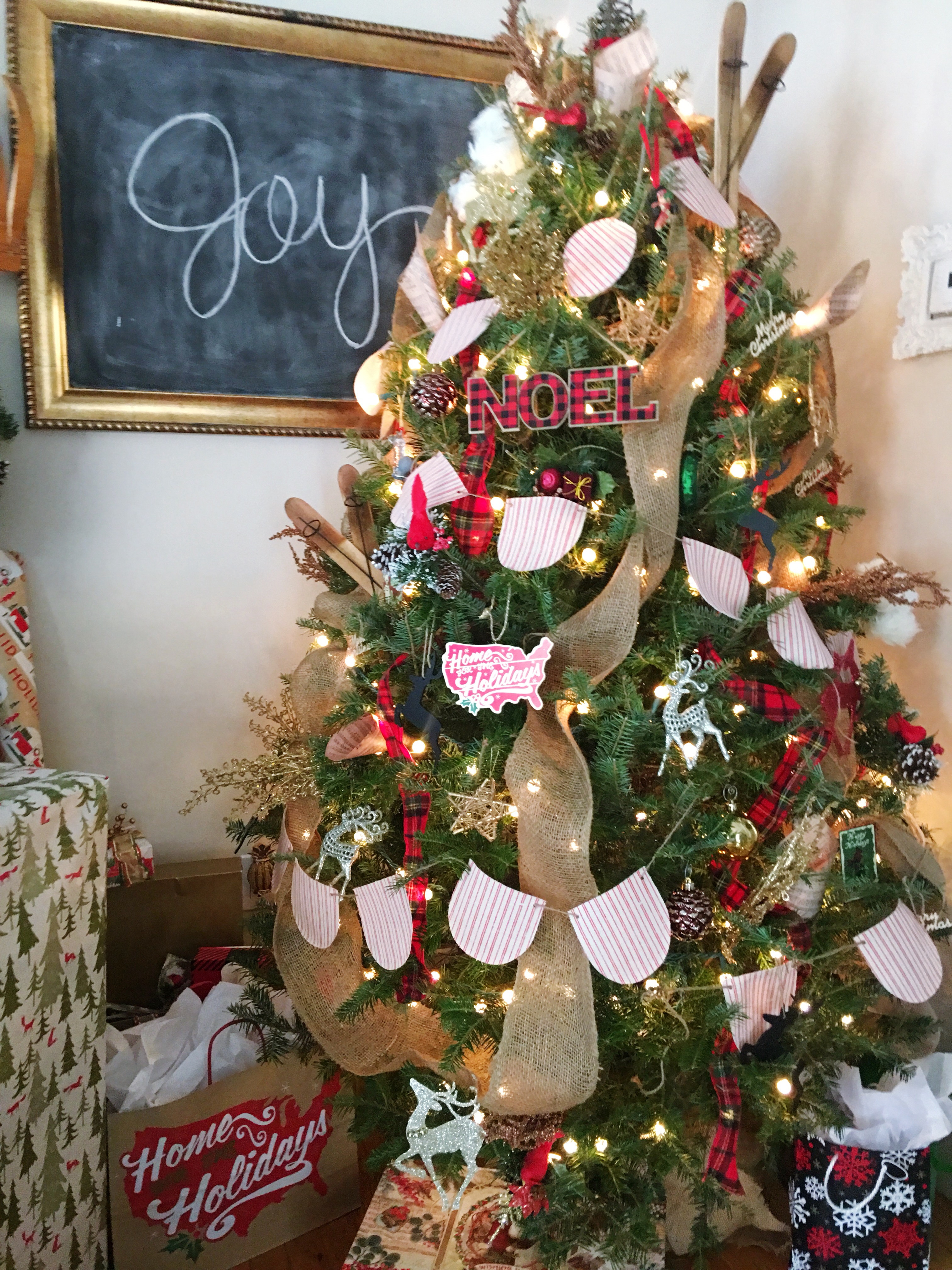 This year, I kept things pretty much the same with a few minor tweaks here and there. I love the real tree we bought for our living room. The past few years, we’ve gone to this cute little nursery near our house. They have it set up so cute and we really look forward to going every year and picking out a tree on a chilly night. It’s the little things, don’t you think? Because I’ve had zero time, my plans to flock the tree never happened. It took us days to get lights and ornaments on it as it was and I couldn’t wait any longer so flocking was out. I mixed in the usual burlap with tartan plaid and buffalo check. One of my favorite Target finds ever are the mini skis. I wish they would make those again. I like to keep things along the lines of a rustic cabin/woodsy feel.