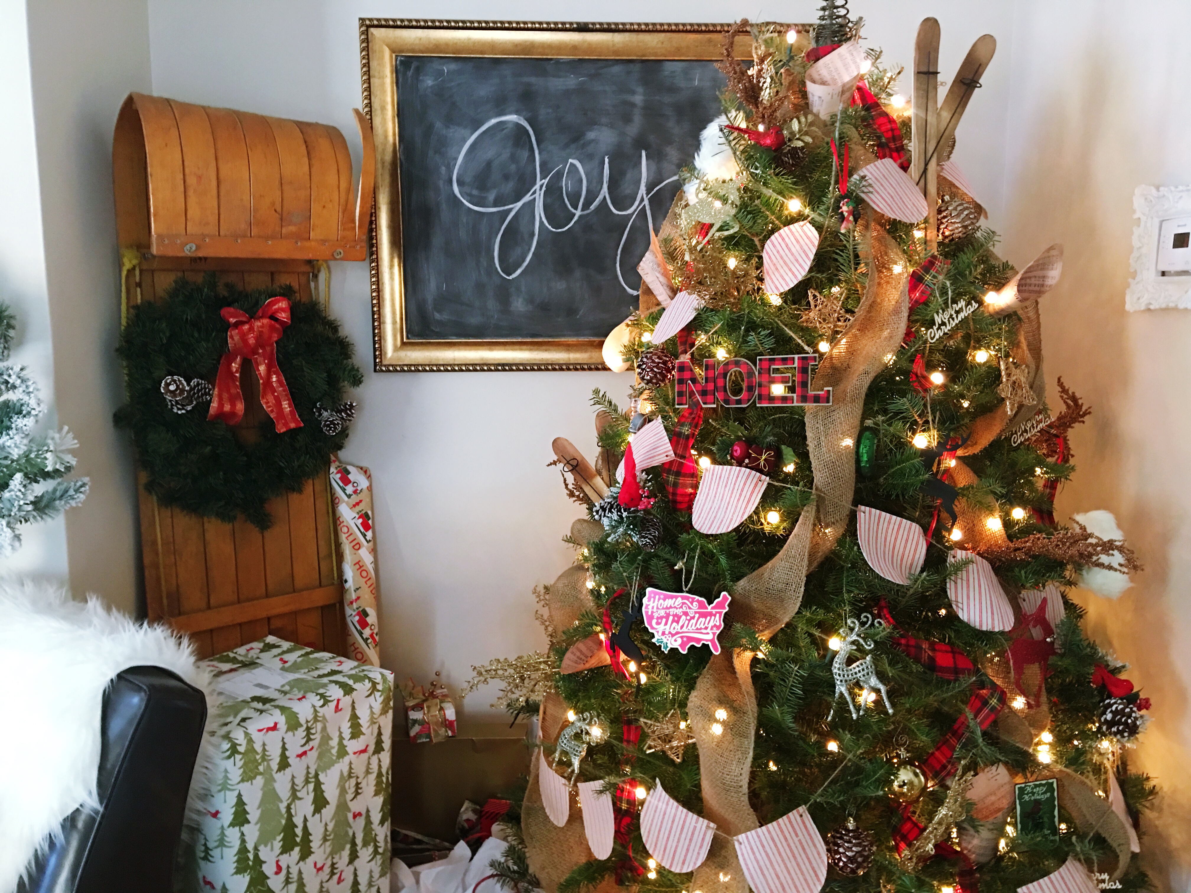 The small tree that was on the other side of the fireplace last year, ended up where we had it our first year in the house. We moved in the week before Christmas and weren’t even going to get a tree but my grandparent’s insisted I take their old tabletop tree. I was really glad we did because it made the house feel more like home. That tree has the same tartan plaid ribbon and some simple red and blue ornaments. A pair of skis made they way into this tree again.