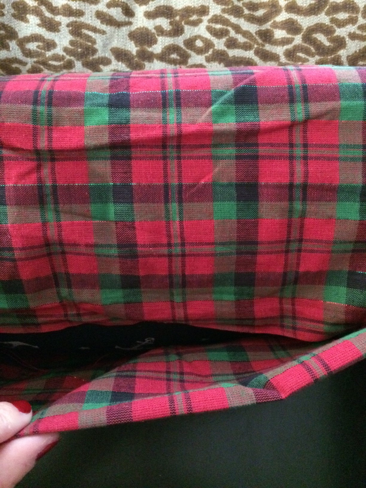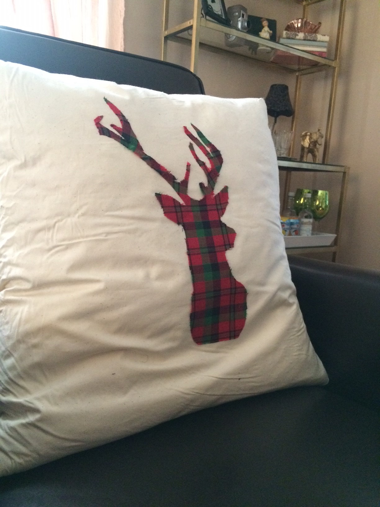 Oh, but I was’t done there. I need to bring in some plaid and reindeer! I picked up this feather filled oatmeal pillow at IKEA for $5(ish) and half a yard of fabric at Joann for $3. I took an old pillow I already had and made a cover for it. I made it like an envelope closure so I could easily pop the pillow out. Then I used the leftover fabric and cut out a reindeer based on one I’d printed. I then used some heat and bond and applied it to the back of the reindeer, then ironed it onto the pillow. In hindsight, I would have put a square of the bonder on the reindeer and then cut around it after it had adhered to the fabric, but before ironing onto the pillow. Instead, I cut strips and applied it to the reindeer that way. I found where it overlapped the edges, the frayed fabric was sealed a little and trimming the excess off made it look cleaner. If you do go that route, make sure you don’t mind getting your ironing board cover a little messy with bond and be prepared to pull it up quickly.