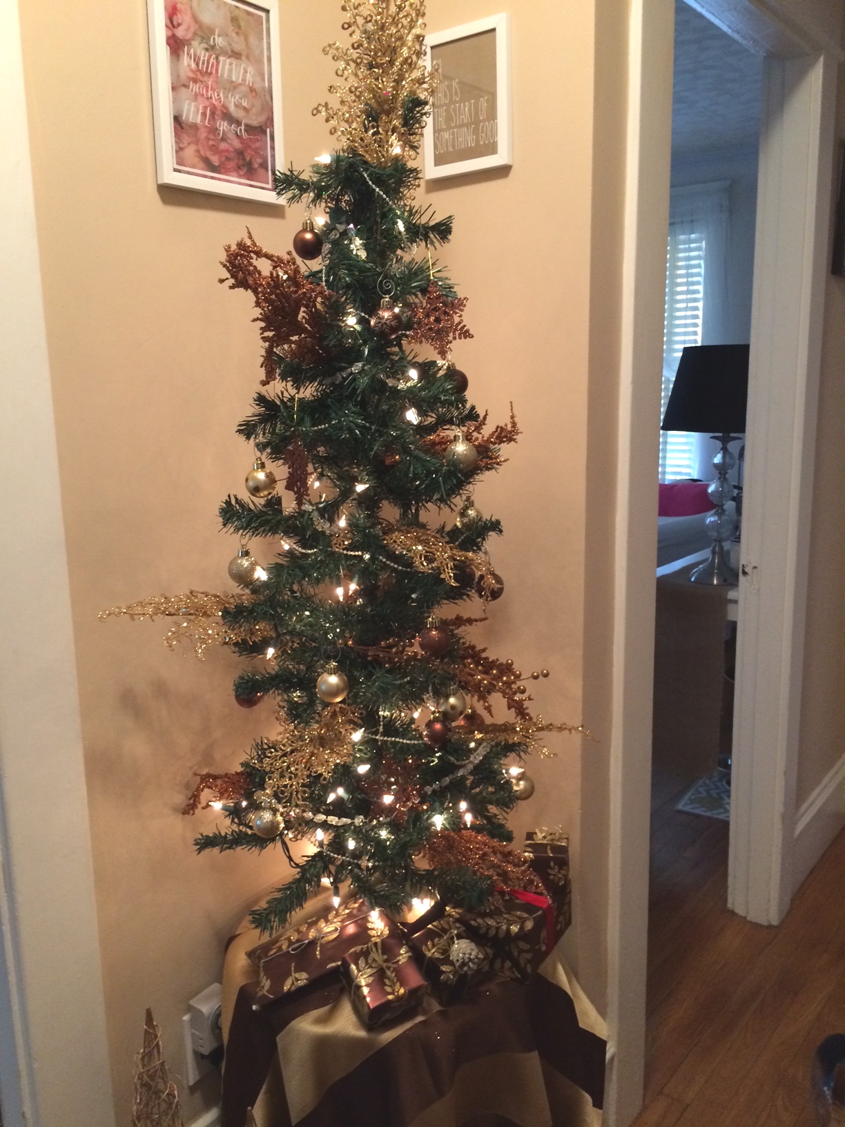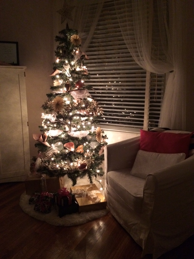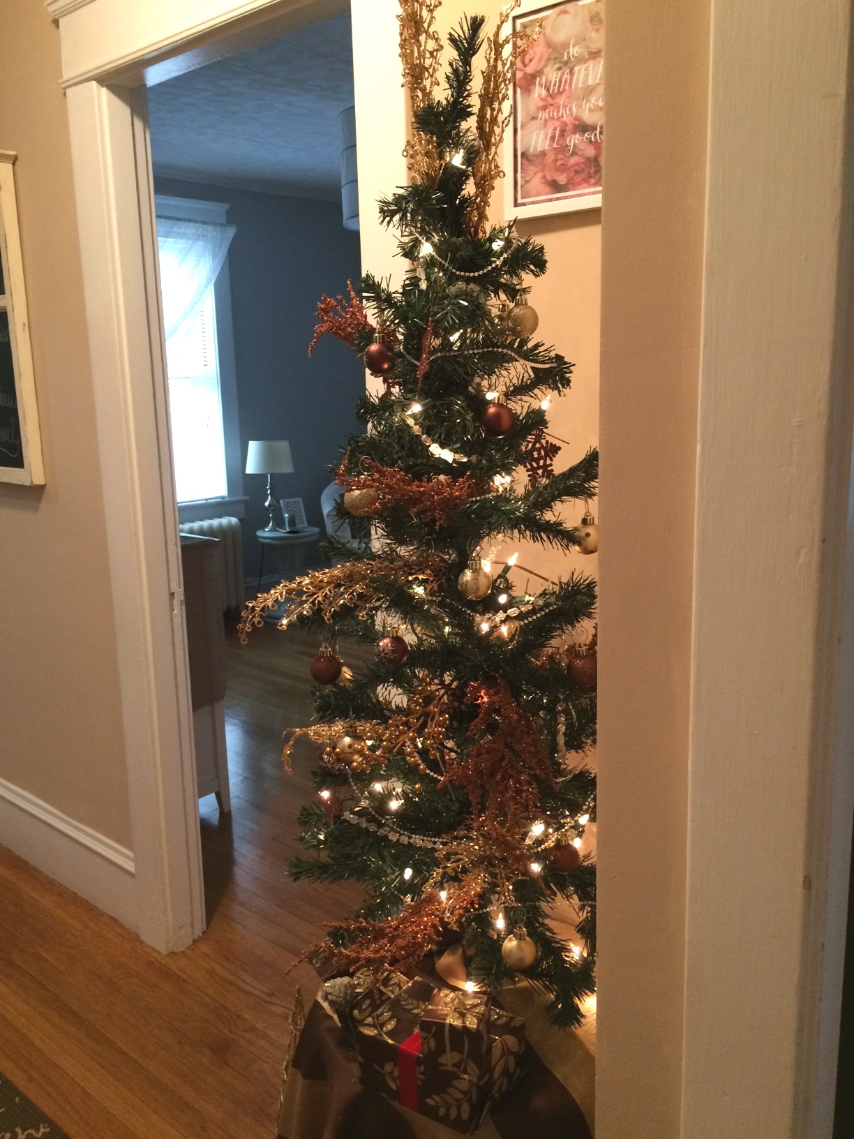 Everything on the tree, aside from the pearlescent garland which was old, was bought last year on clearance at Michaels and Target after Christmas for pennies. Literally, pennies. Again, the hall is dark and doesn’t really get any natural light so excuse the dark pictures.