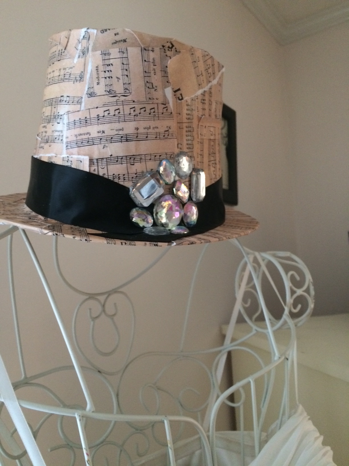 To continue the music theme, I made this papier-mâché hat that I picked up at Michaels and used my extra sheet music to create this. It’s my vintage take on the Bling Beanie, haha!