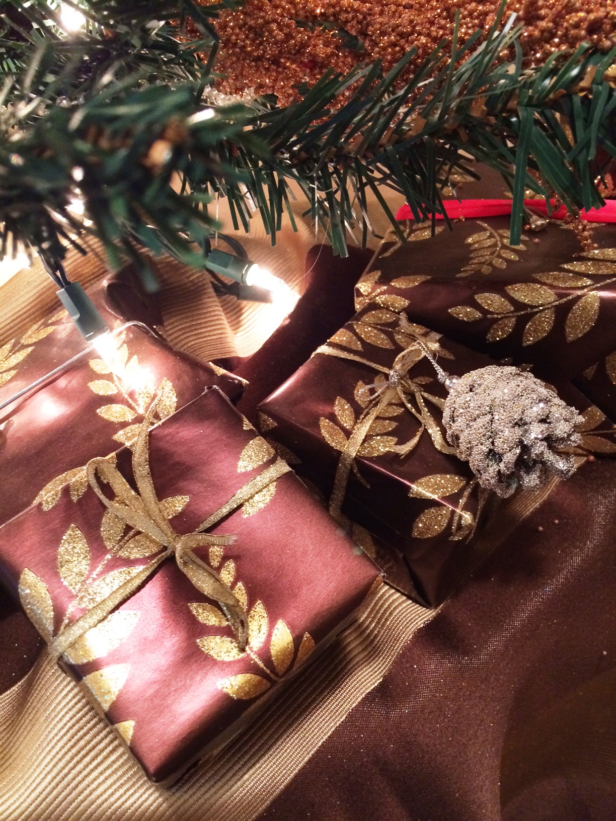 Just outside the office in the hall is this skinny little tree. I bought it a few years ago after Christmas for $5! I’d never used it until now because it didn’t have legs…now I know why it was $5. Jamie built me some wooden legs and off I went to decorate it. The hall is neutral with tan walls (Benjamin Moore’s King Arthur’s Court – also currently in the living room and our bedroom) with a brown rug so I wanted to keep the same color scheme. I already had the “presents” wrapped from a few years ago so they were the perfect compliment to the tree.