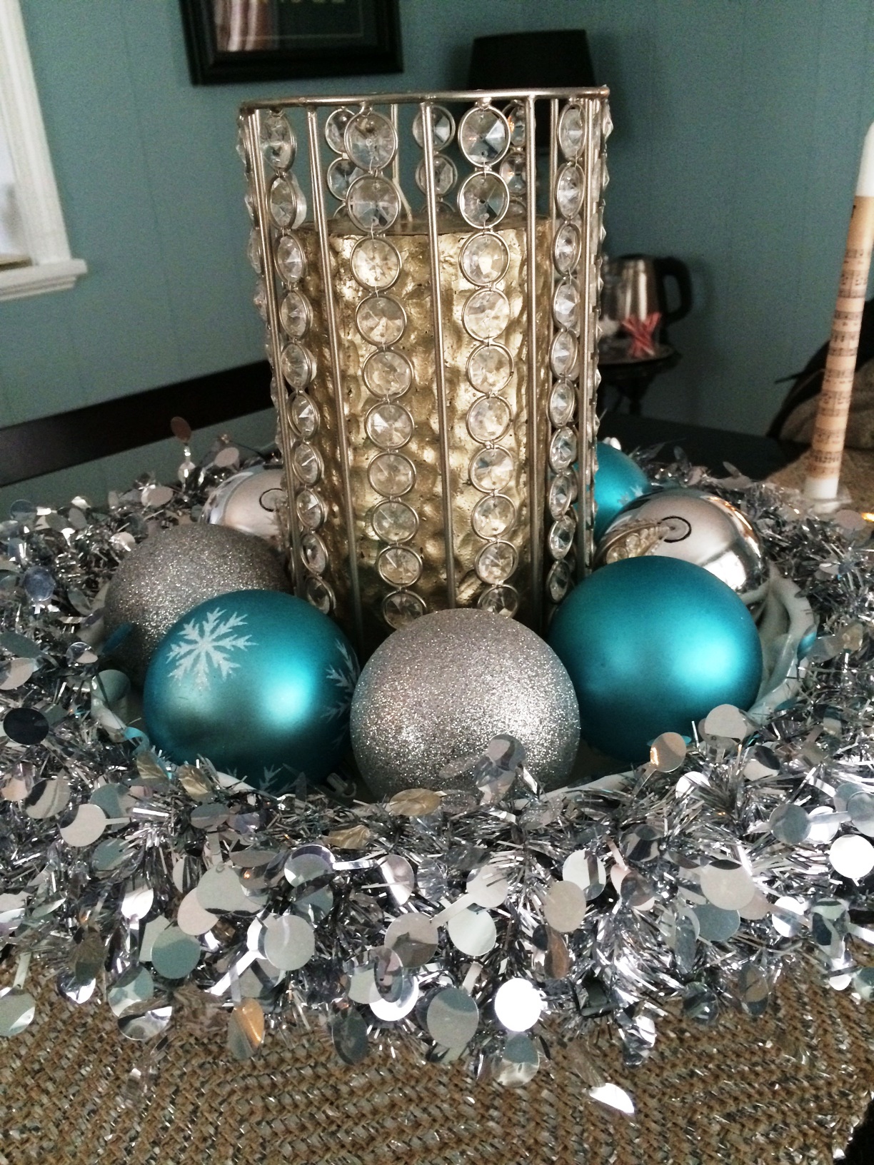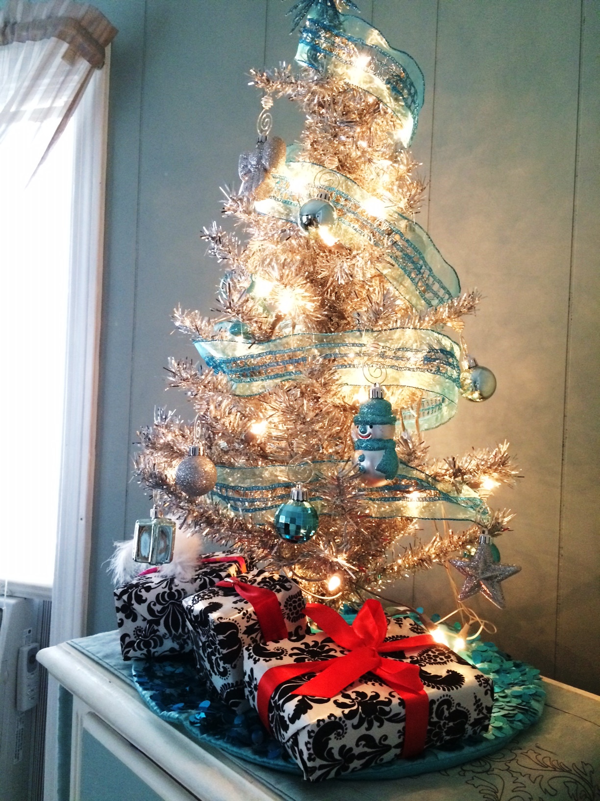 I love this little silver tree. My mom gave it to me the first Christmas Jamie and I were living together. Our dining room was the same color it is now and it was such a nice color combo. It’s a custom color we had done based off a table runner I’d bought. I’d found these silver and turquoise ornaments, along with the tree skirt, at Target that year. I use that as a base to create a winter wonderland themed room. I also got the wrapping paper at Target a few years ago. It matches the chair we have in the dining room perfectly and it has such a nice texture to it.
