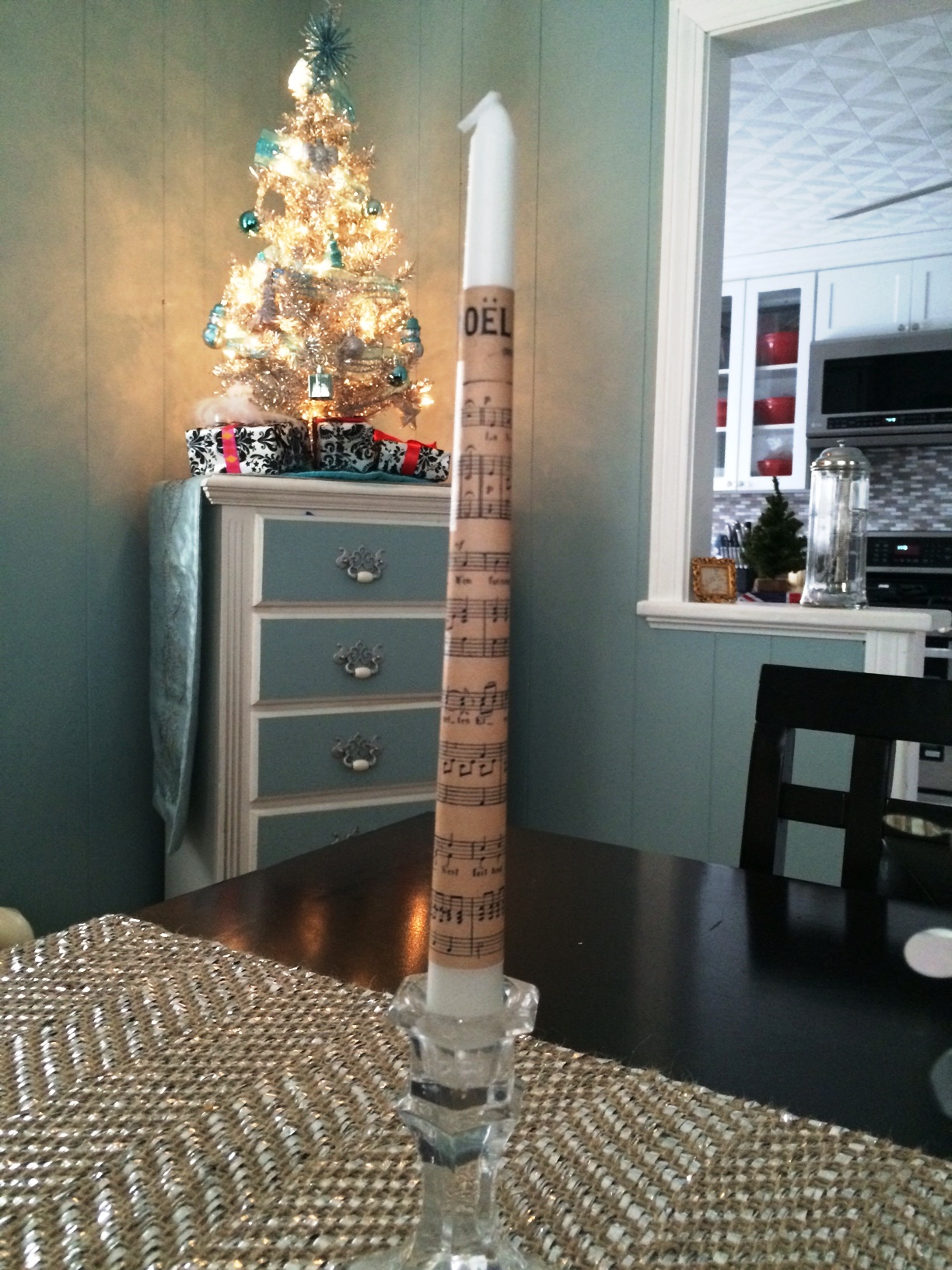 I used some more of my trusty sheet music to wrap the candlesticks. They went from drab to fab in just a few seconds. I picked them up, along with the holders, at good ol’ Dollar Tree. Love that place!!