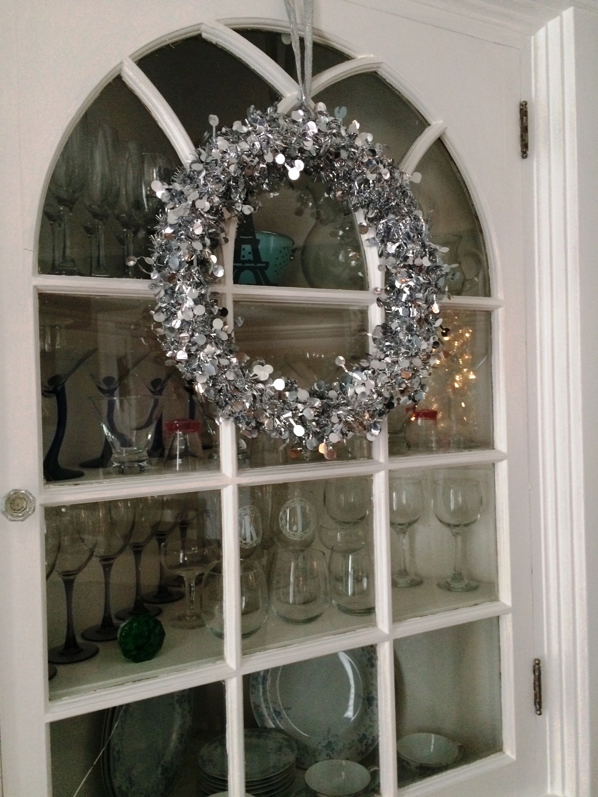 I hung the second wreath (which I paid full price for — maybe $5?) over the china cabinet this year.I had it in between the windows but had another plan for them and thought the cabinet needed something extra.
