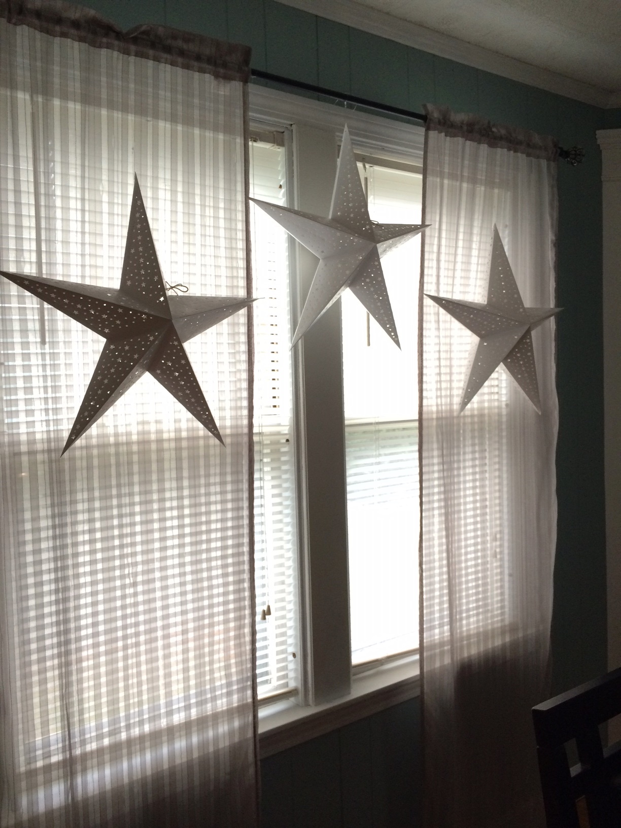 My friend, Kelly, gave me these cool paper star lanterns for my birthday this year. I love how they look in this room with the light peeking through them.