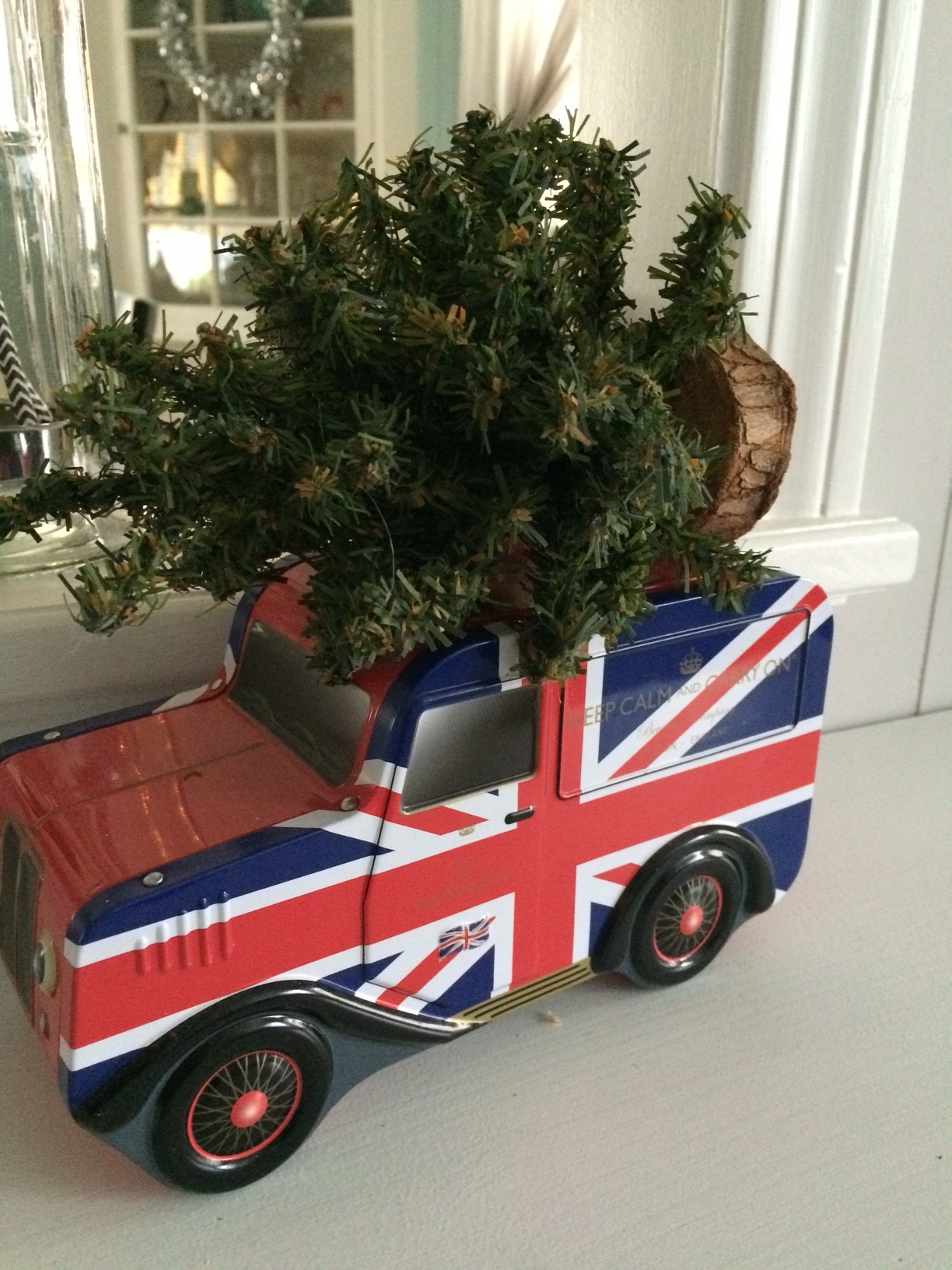 I do have one other little tree in my kitchen. I went with the whole Pinterest idea and strapped a tree onto my vintage looking UK car. I need to wrap some bakers twine around it to complete the look but for now, I still think it’s pretty darn cute!