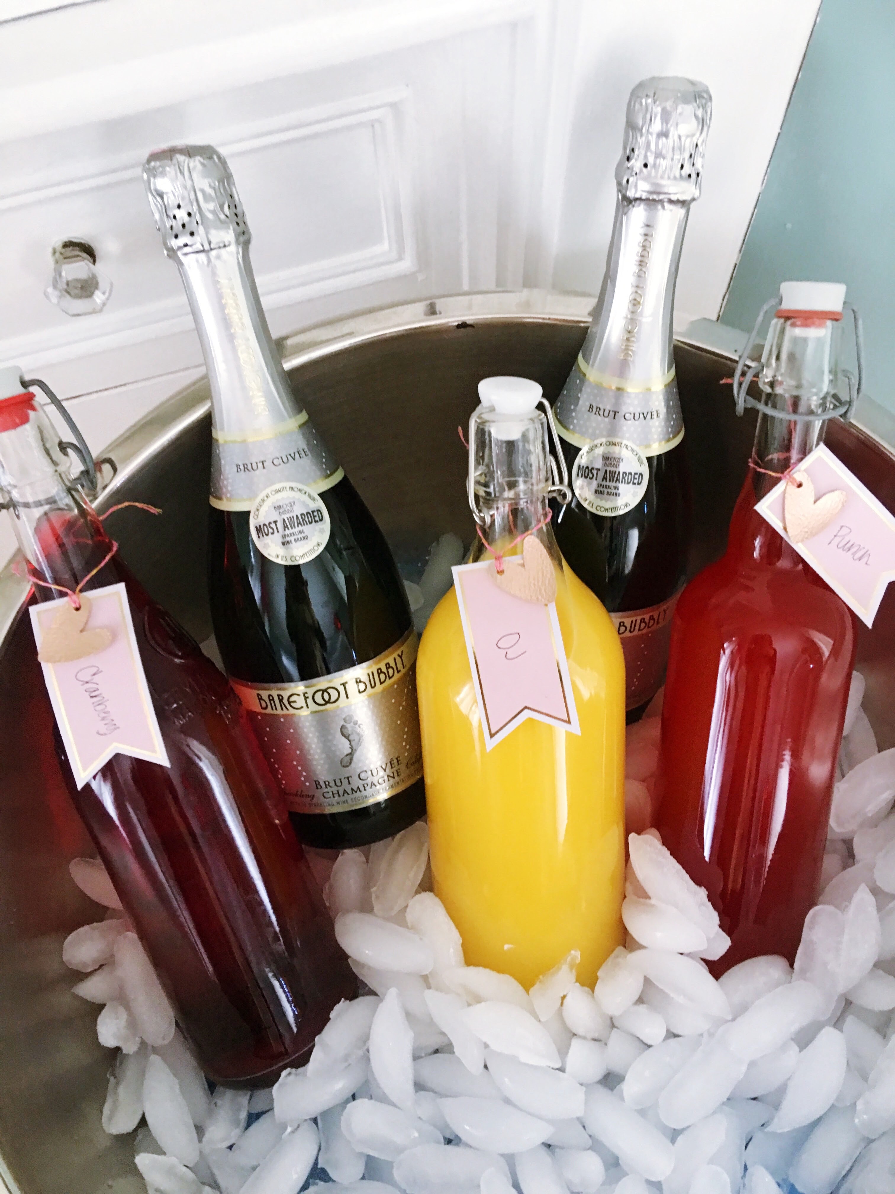 No brunch is complete without mimosas and I sure do love me some champagne for breakfast (or anytime of day!). I bought a variety of juices and poured them into glass bottles. I filled my oversized champagne bucket with ice, added the juices and champagne and the girls helped themselves. Super easy mimosa bar!