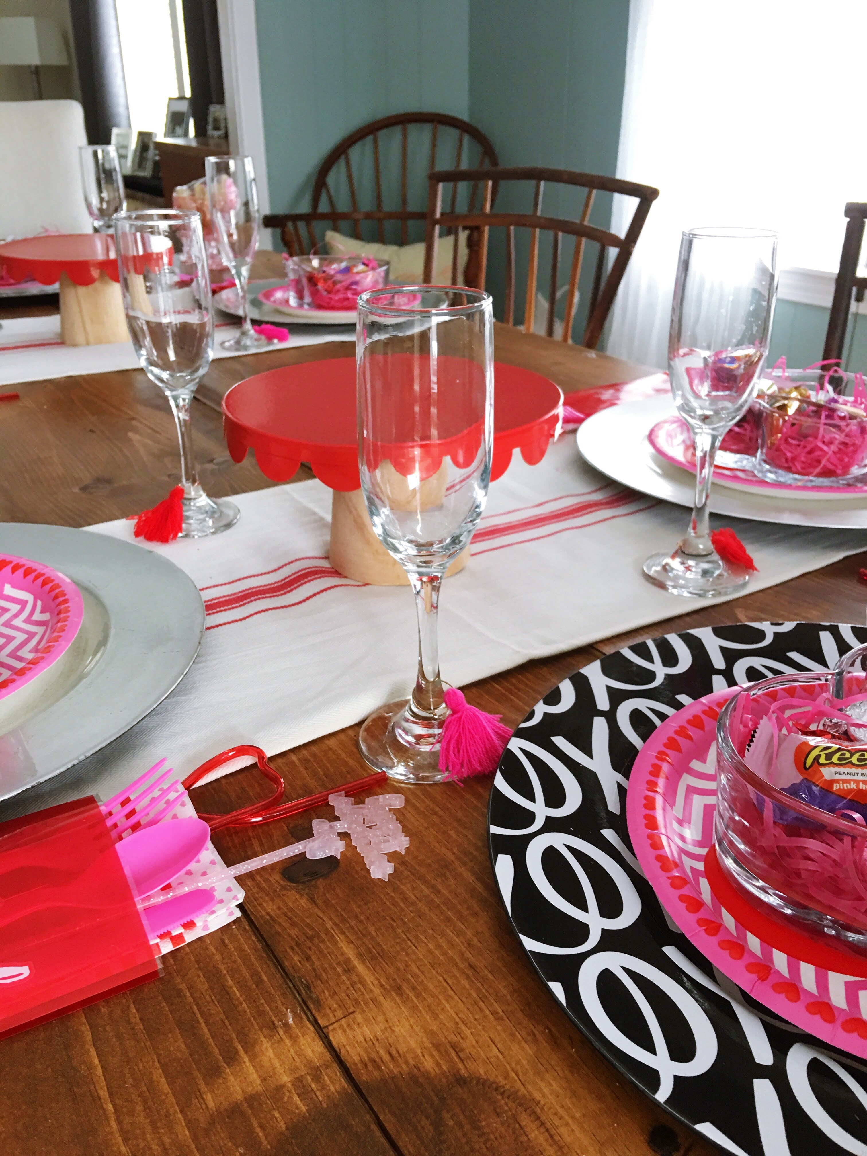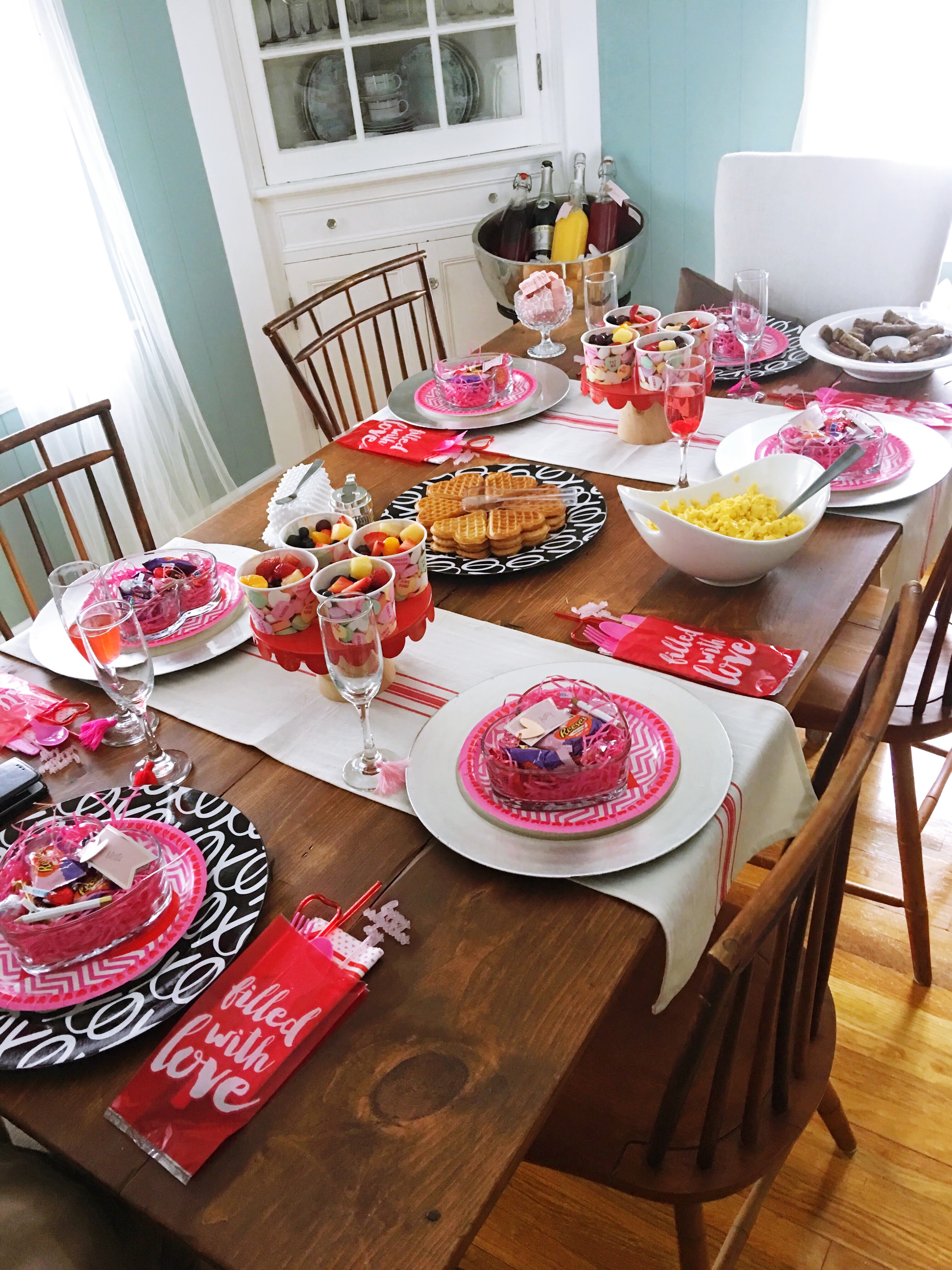 I styled the table with silver and black and white XO chargers with lots of pops of red and pink. Since I wanted to be able to sit and enjoy my guests, I made sure clean up would be simple. Paper plates and plastic cutlery did the trick. Everything got tossed afterwards and the only thing to wash was the champagne glasses and serving dishes.