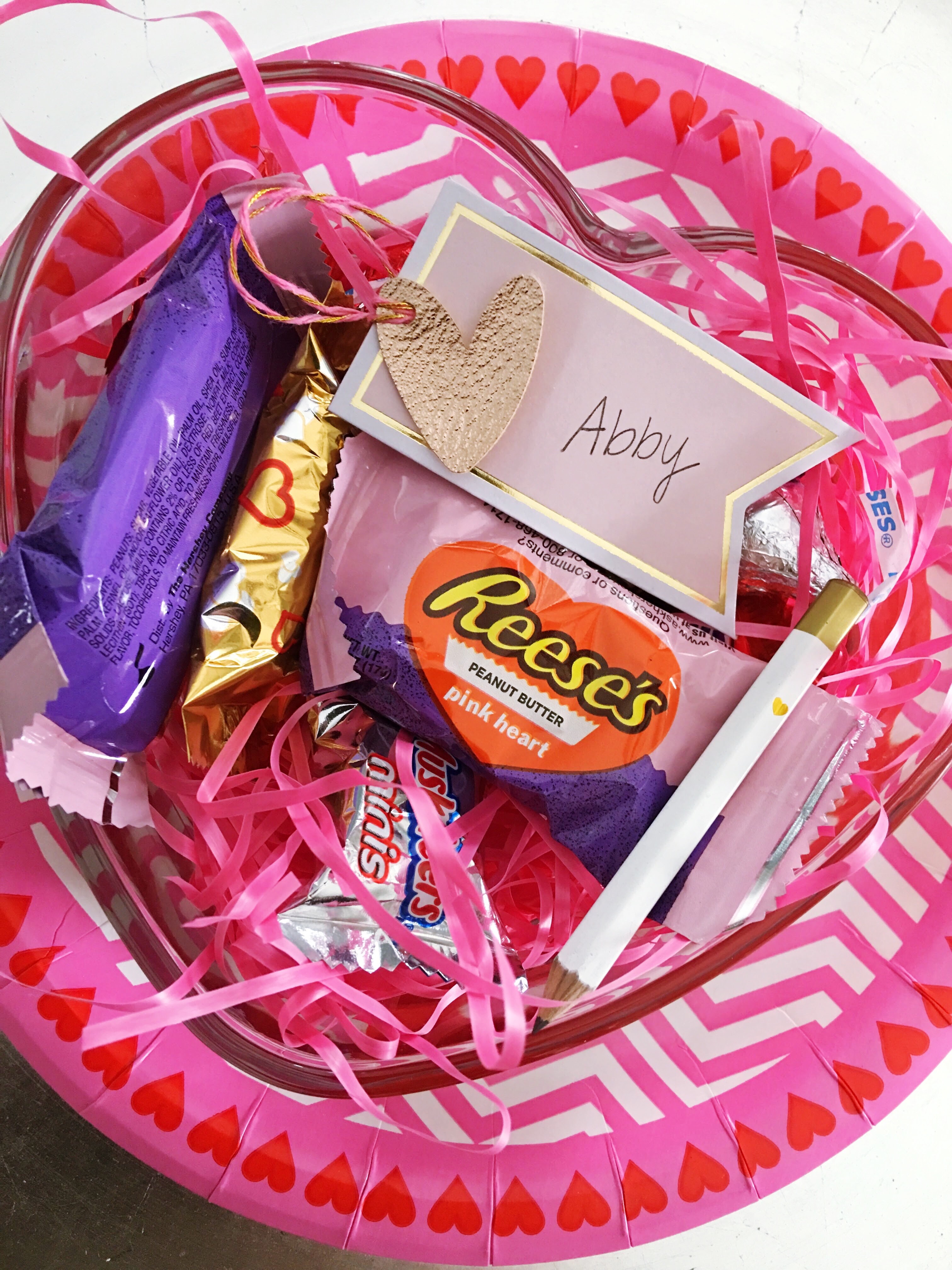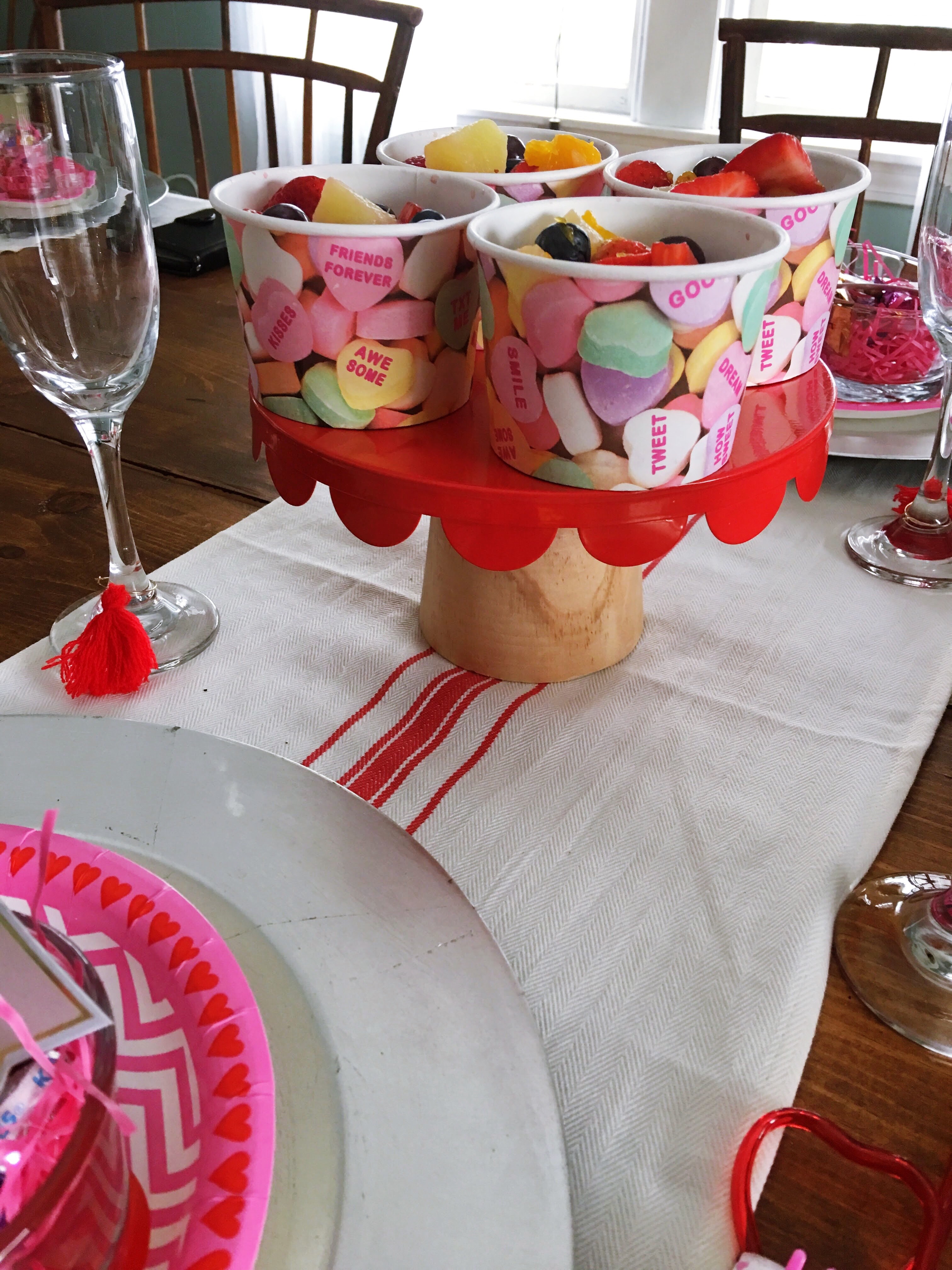 I also bought heart shaped glass bowls from Dollar Tree for each guest. I filled them with some pink basket grass and added candy to them. I tied gift tags with each girl’s name on it and they took them home as favors.