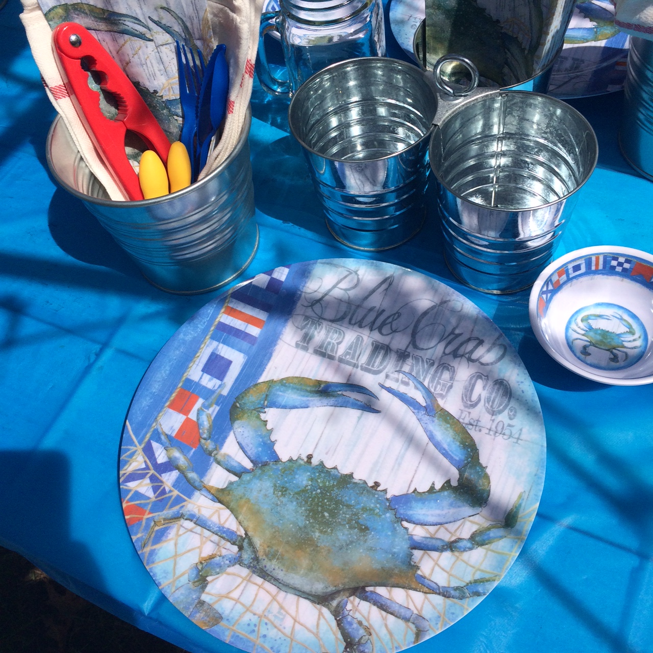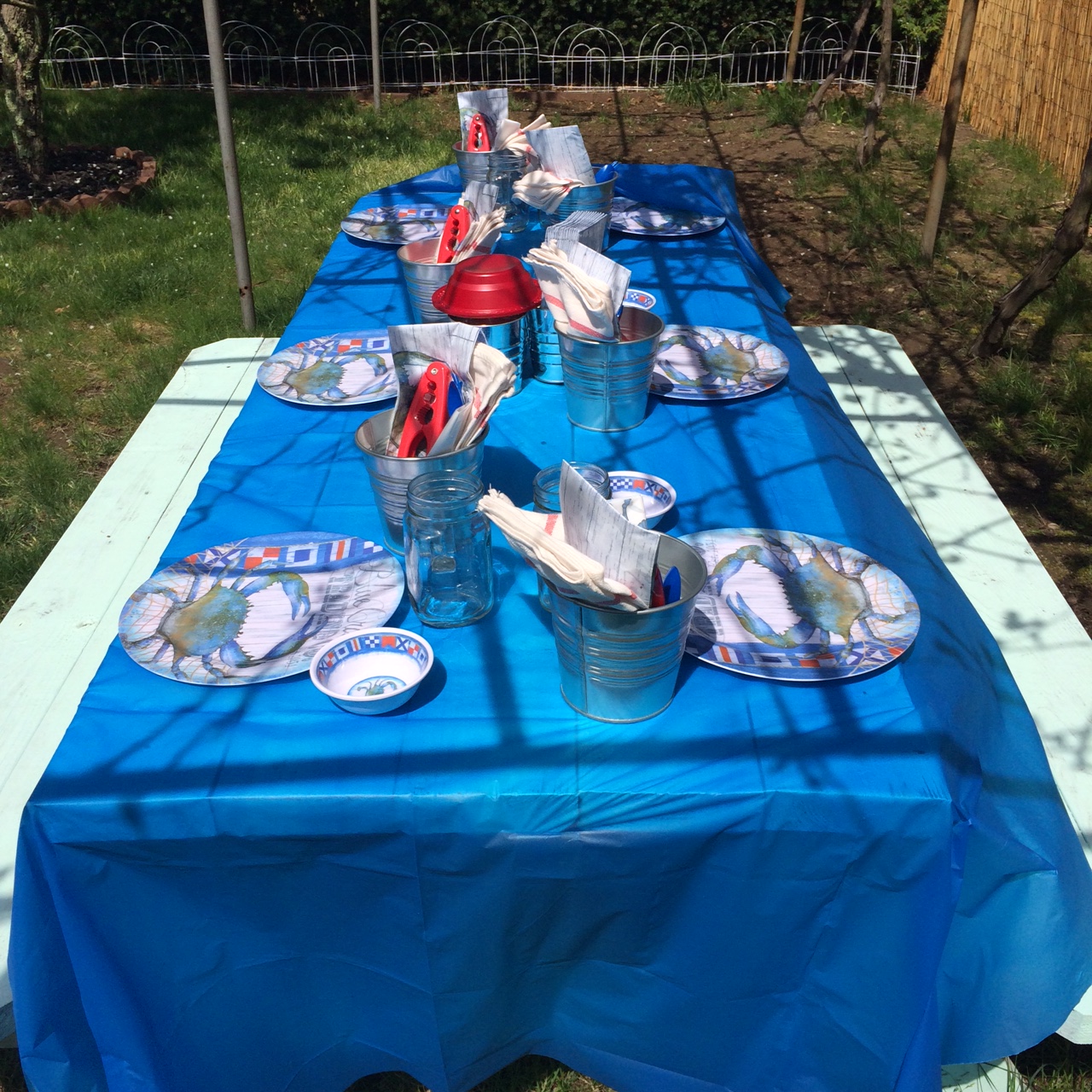 We ended up having gorgeous weather! To make things easy, I bought a blue plastic tablecloth from Dollar Tree to cover the picnic table. I also bought the crab crackers and utensils there along with some crab flavored potato chips! I used 99¢ metal planters from IKEA at each setting and filled them with a cracker, utensils, corn holders, a paper napkin, crab bib (both from CTS that matched the plates, etc.) and a big cloth napkin that I got at IKEA for 79¢. Days after I bought the metal buckets, the price increased by $1 so I bought them in the nick of time. Still a great price either way! The buckets were to be used for the crab and clam shells during lunch.