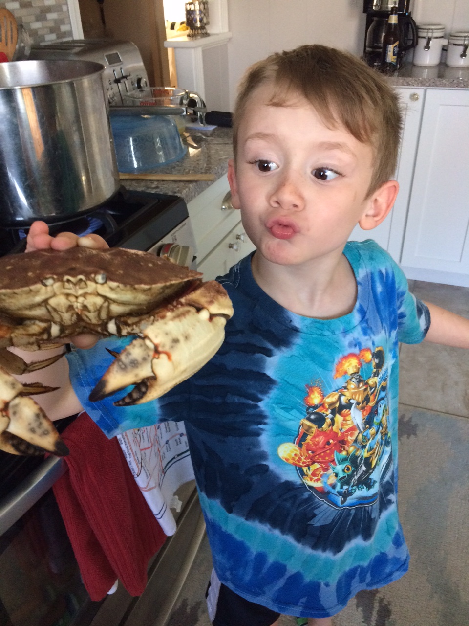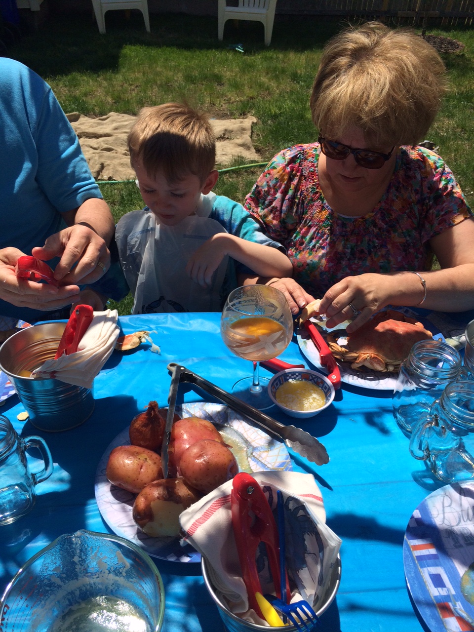 We decided to get crabs for the lunch as well and since they, along with a clam boil, can be a bit messy, we thought hosting it outside would be the perfect spot. Here’s Ben before with his “pet” crab. He begged me to keep it, haha!