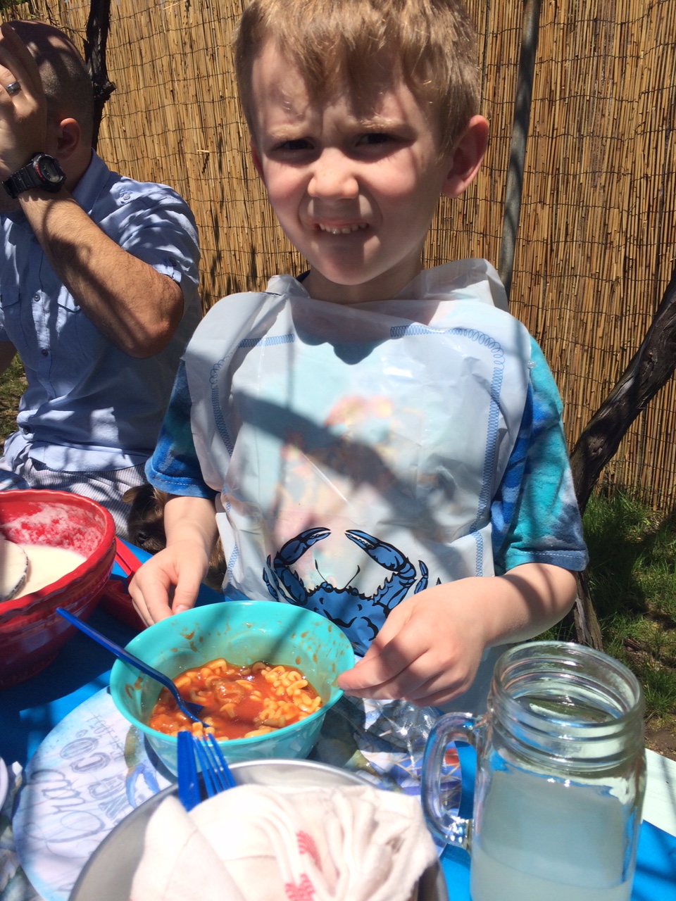 Fussy Benny (seen here enjoying Spaghetti-o’s) decided to shock us by not only trying crab but a clam as well and liking both!