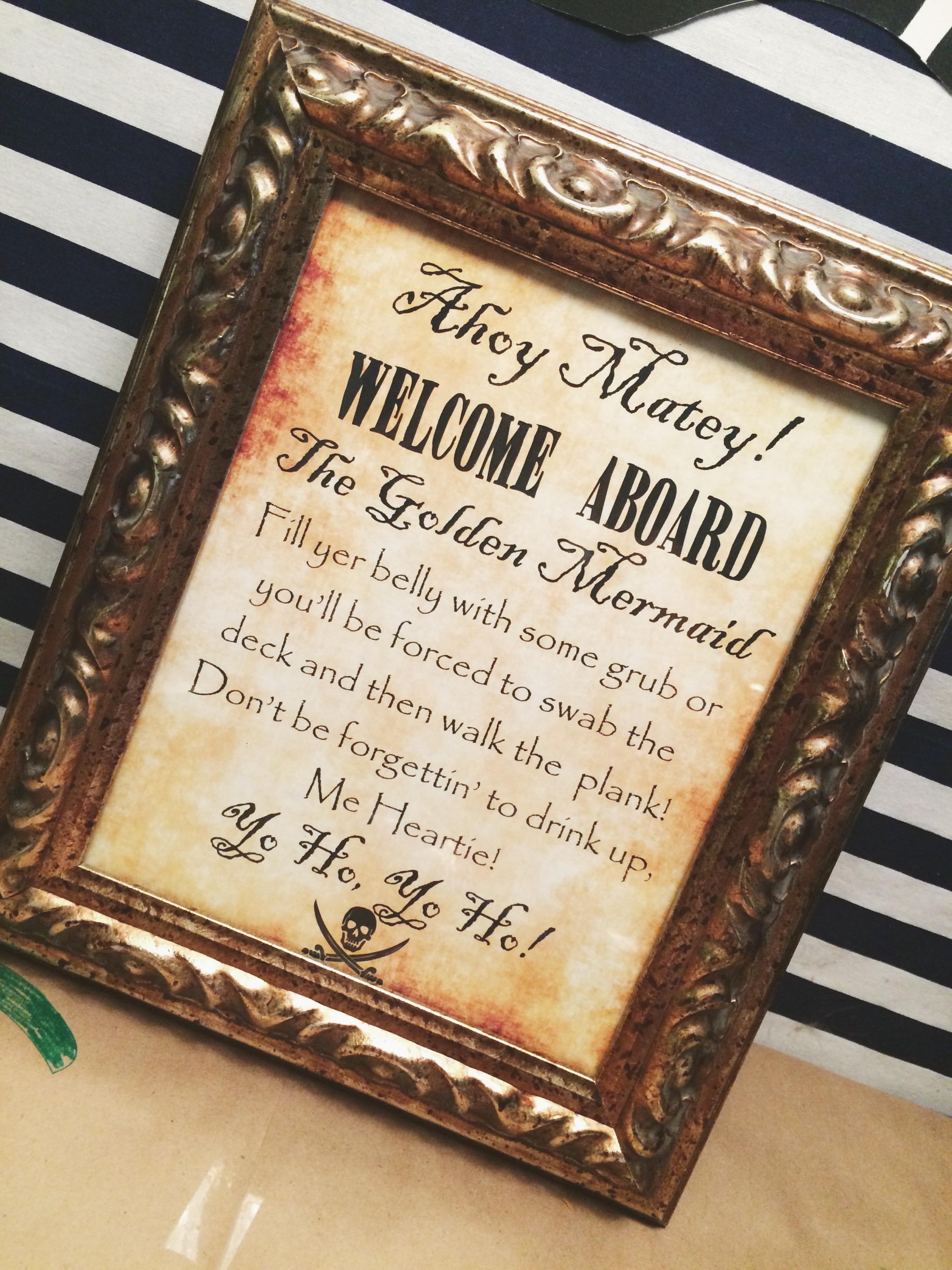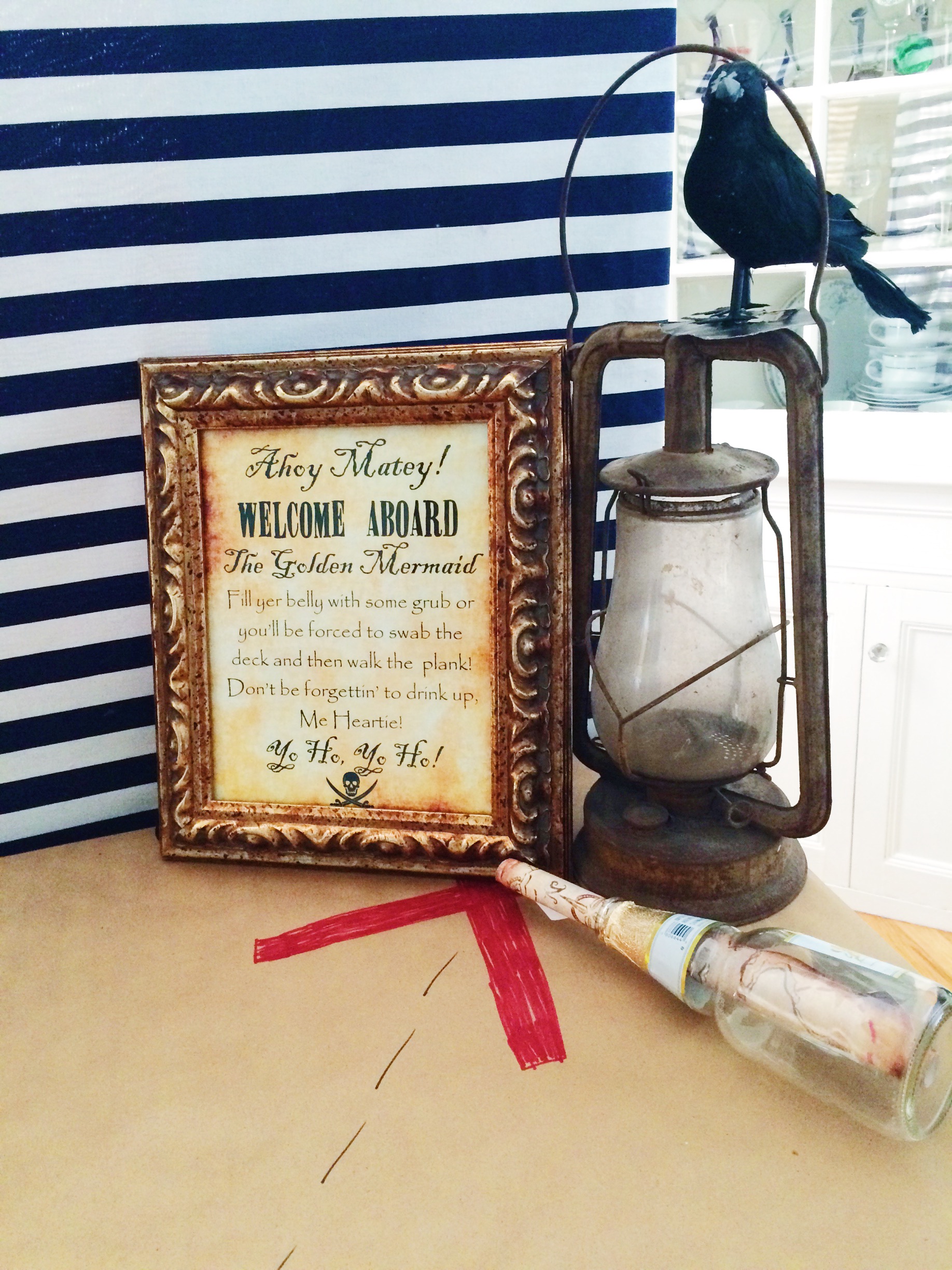 Prior to my shopping, I’d created a bunch of printables for the party. I love printables – they can make the whole event come together. I made some 7” round plate inserts that I just cut and taped inside. Next I made the welcome sign full of fun pirate jargon. I also made the food signs and water bottle labels and printed a treasure map and a pirate flag.