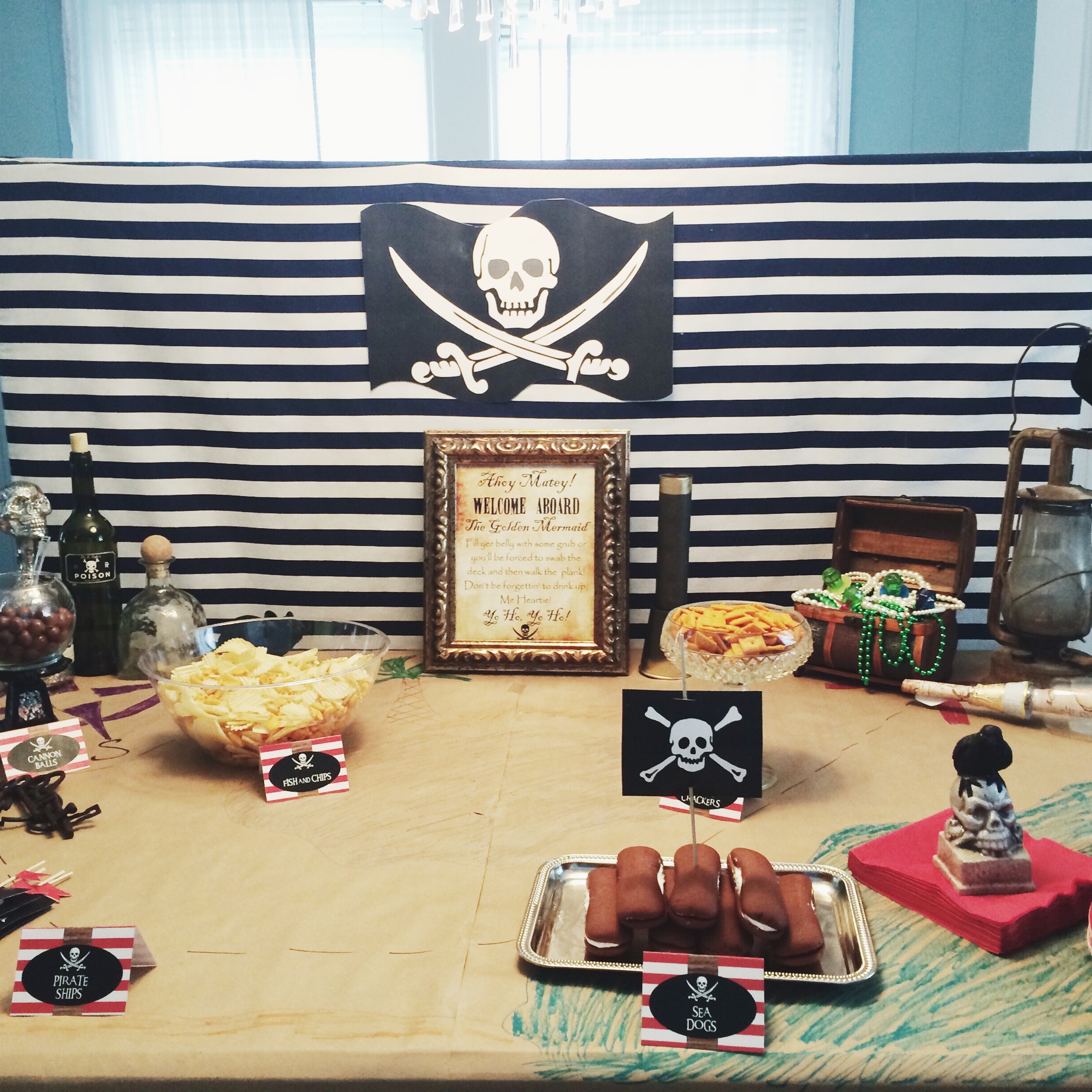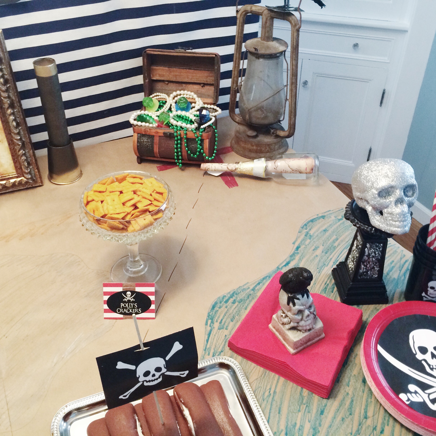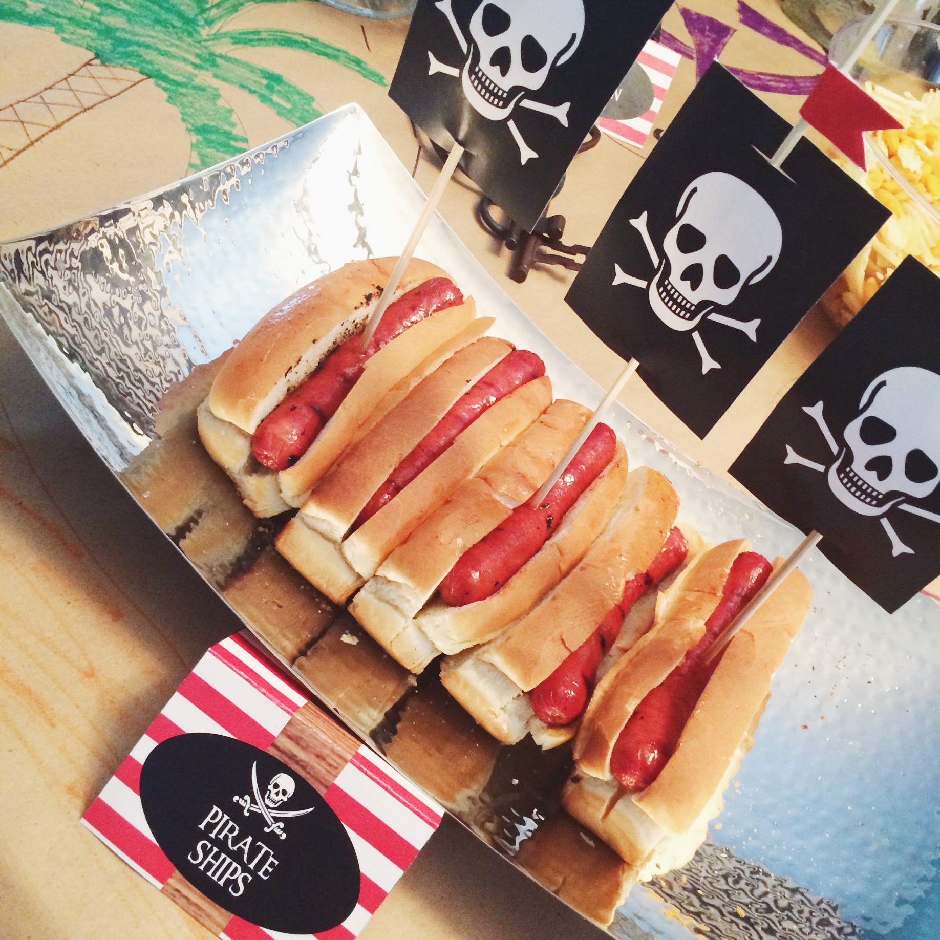 For food, I kept things simple. Hot dogs made to look like pirate ships became “Pirate Ships”, Devil Dogs became “Sea Dogs”, Goldfish crackers and chips became “Fish and Chips”, cheese crackers became “Polly’s Crackers”, Whoppers became “cannon balls” and water became “Caribbean Sea Water”.