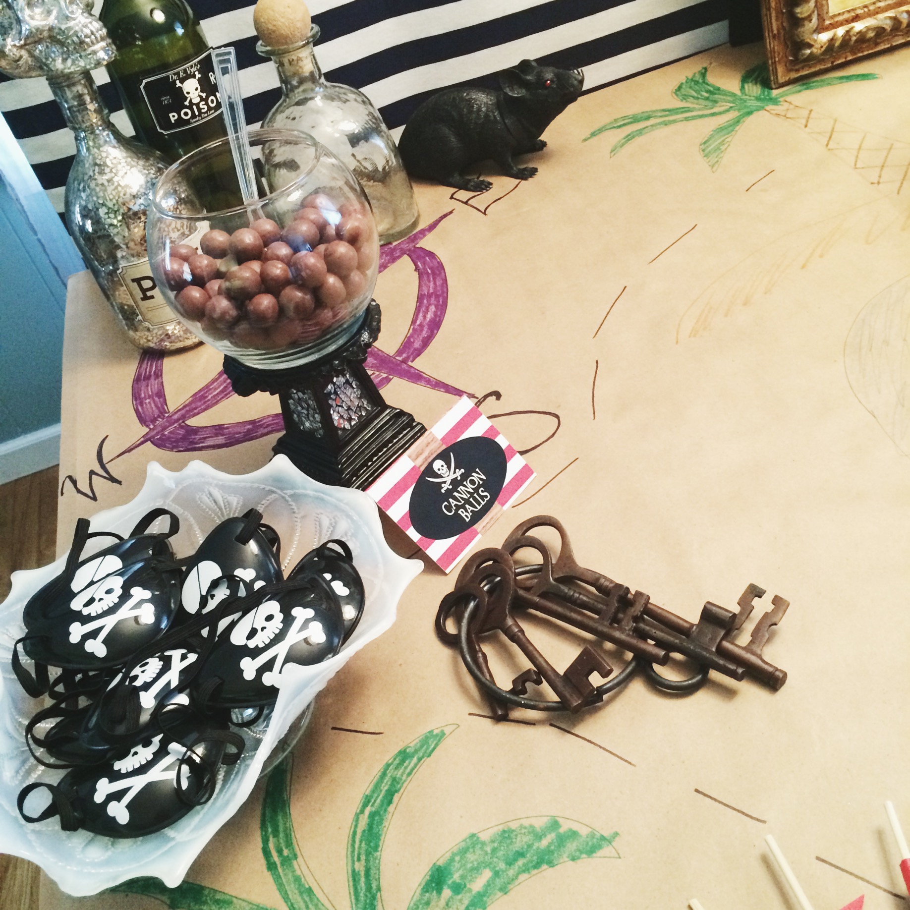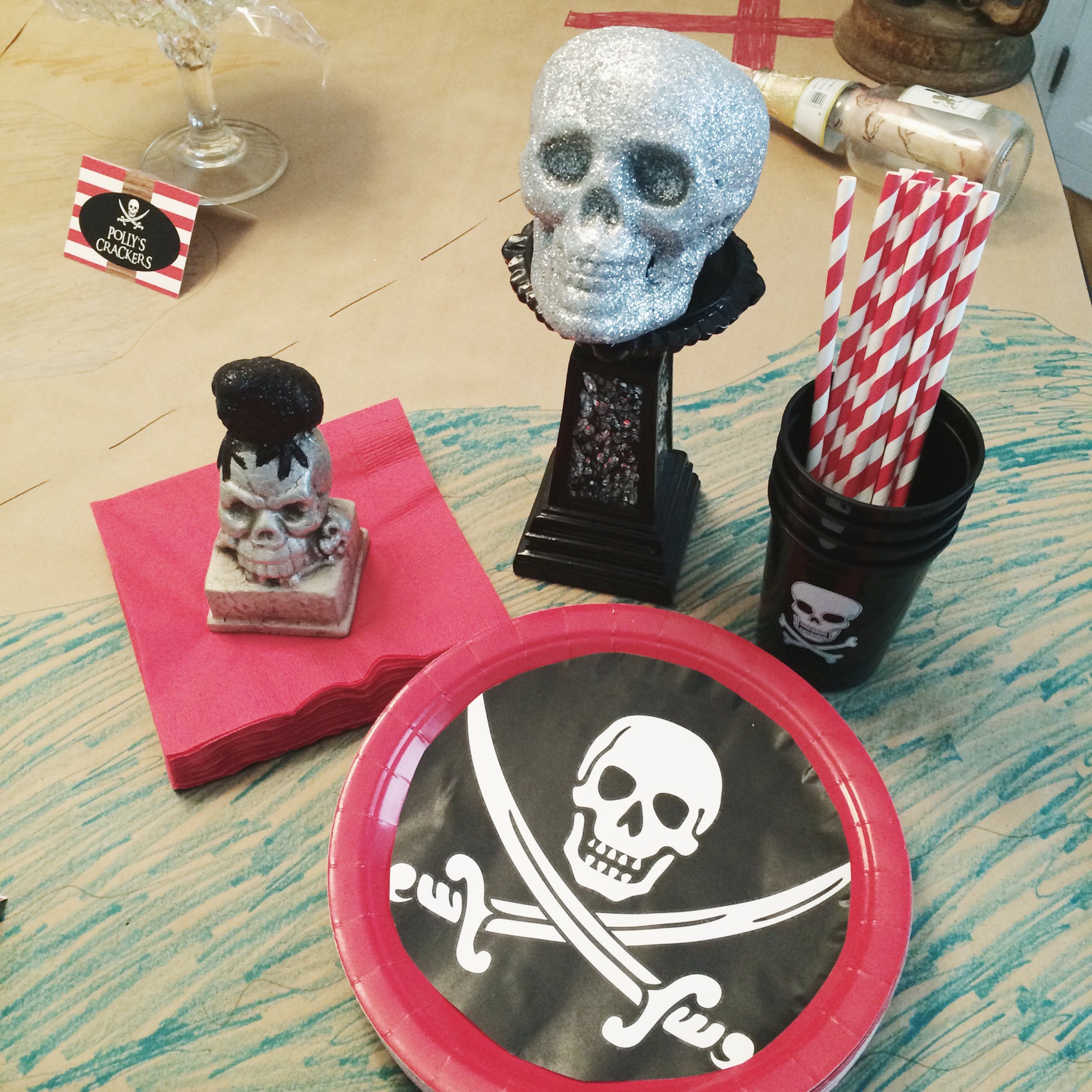 The nice thing about NTLAPD is that it’s close to Halloween so the stores are filled with all kinds of pirate related goodies. I had some big ideas but I was keeping things small so I had to tone it down. I went to my favorite place, Dollar Tree, and picked up some red plates and napkins, a roll of kraft paper and the skull and crow statue. I also grabbed a couple of bags of Whoppers to serve as “cannon balls”. I went home and dug through my Halloween décor to see what else I could use. I pulled out the silver glitter skull, crow, and rat (all previous Dollar Tree finds) along with some old wine bottles with “poison” stickers on them and another one with a skull on top that I got at HomeGoods last year. Then I went into my seasonal décor closet and grabbed the vintage lantern and frame to put my welcome sign in. I also added the skeleton keys which were a gift from my aunt when we visited the Tower of London. A few days earlier, I’d gone to Target for a few things and surprise, surprise, left with a lot more (I know everyone reading this is nodding their heads in agreement!). The Dollar Spot had a bunch of summer stuff on clearance and I grabbed a couple of packs for red and white striped straws for 30 cents each! After I spent half my paycheck in that aisle, I headed over to their party aisle. I love their Spritz products. I grabbed a pirate hat for ben, a foam sword and a pack of eye patches. Then I brought that home and shared a sneak peek of the party on Instagram.