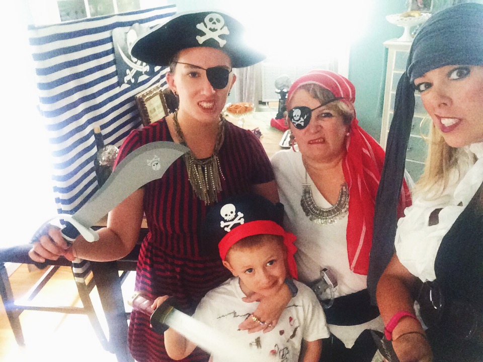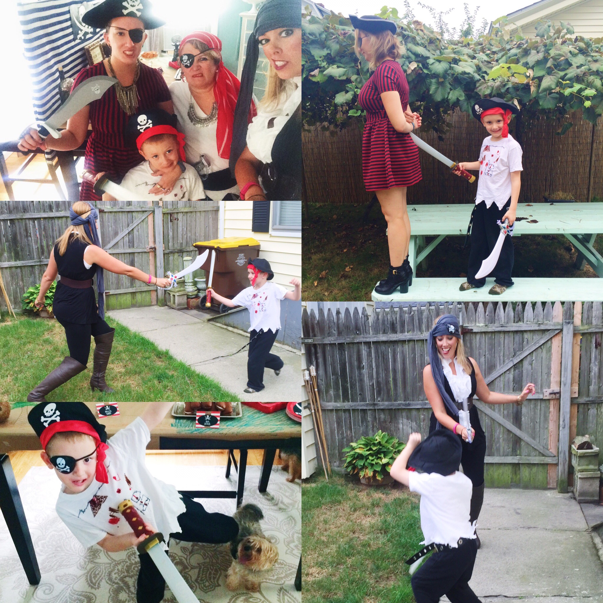 At the last minute, my sister accidentally spilled the beans! Once the jig was up, Ben decorated an old shirt Tori cut up and we completed the look when he got there with the sword, hat and eye patch. My mom, Tori and I also donned our best pirate gear with clothes straight from our closets.